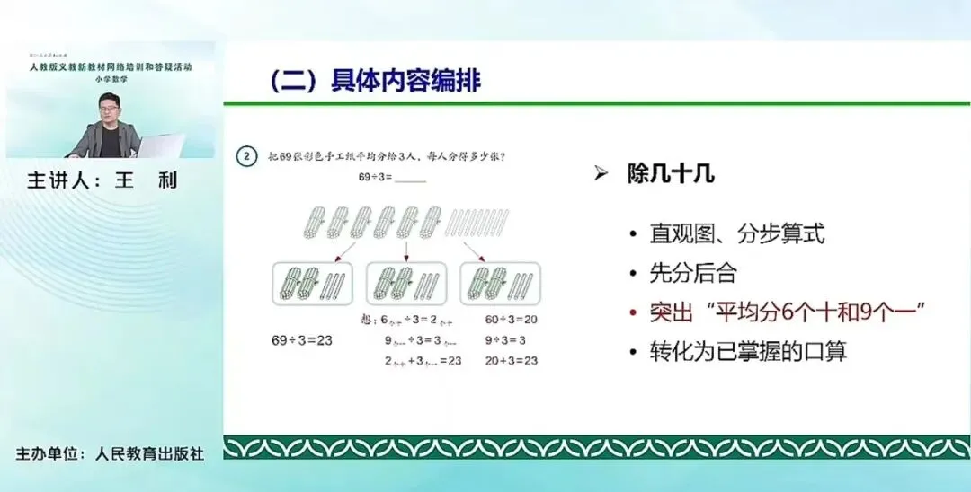 例2延续例1的情境,教学一位数除几十几。其口算方法就是先将多位数按计数单位拆开,再从最高位逐一平均分各计数单位的个数,最后将分的结果合起来。教材同样借助直观图和分布算式呈现算理和算法。将69分成60和9,再分别除以一位数。突出平均分6个10和9个一,这样就将新知识转化成已掌握的口算来解决。