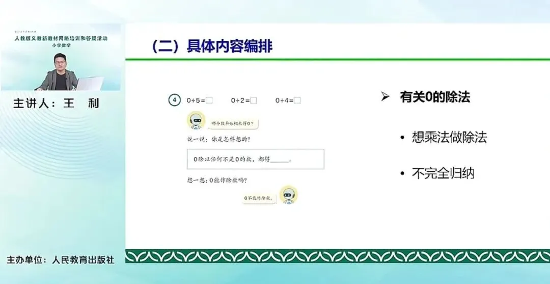 例4,教学有关0的除法。首先出示3个被除数是0的算式,并利用机器人的提示。来提示方法,想乘法做除法。从而通过计算多个被除数是0的算式,引导学生归纳概括出一般的结论。0除以任何不是0的数都得0。最后结合想一想,得出0不能做除数这一结论。教学的时候可以给出一些0作乘数的乘法算式,让学生进行思考,帮助学生利用乘除法的互逆关系进行推理。从而理解0不能作除数的数学本质。