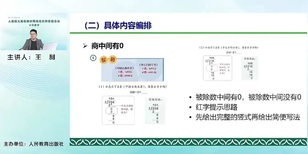 例5教学商中间有0的情况,包括两种情况。第一题是被除数中间有0的情况,第二题是被除数中间没有0的情况。这两题教材编写的思路是一样的。我们来看一下第一题。首先,教材给出除法计算的完整竖式,并通过红字,十位上的0÷2,商是几?来提示思路。最后将可以省略的部分用虚线框框起来,给出竖式的简便写法。