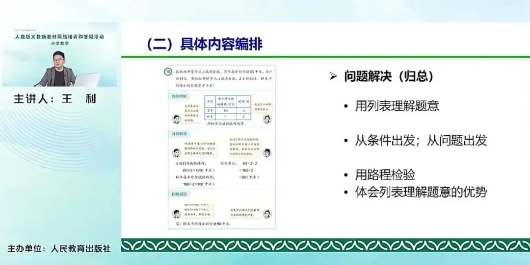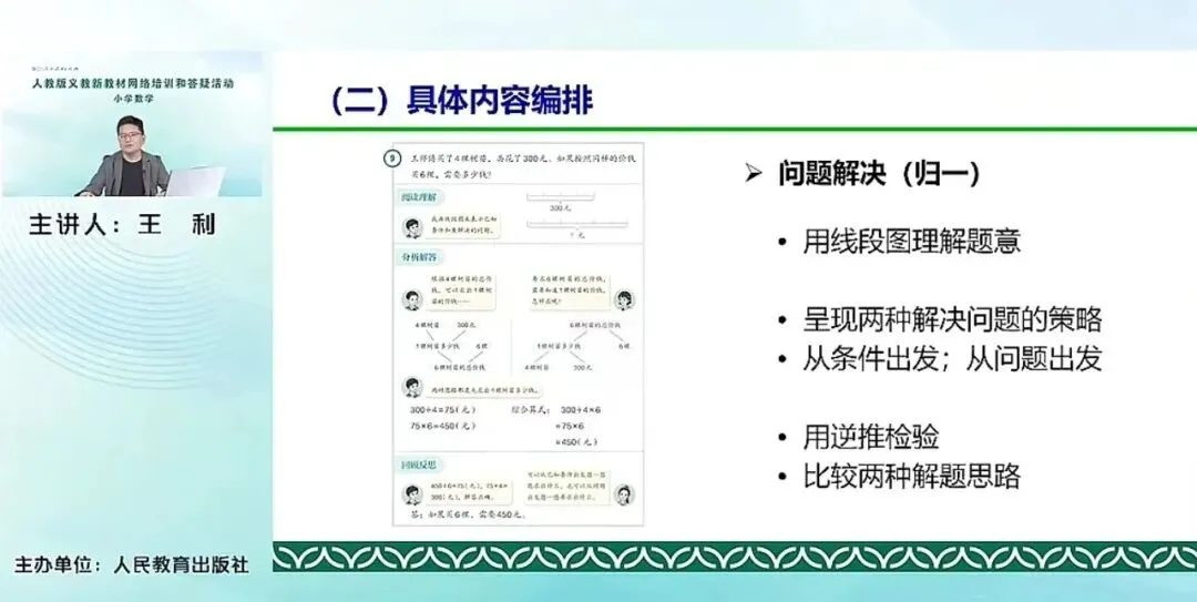 例9教学用乘除混合运算解决含有归一数量关系的实际问题。即先求出一个单位的数量,就是单一量,再根据单一量求出其他数量。在阅读理解环节,教材提供了线段图,直观呈现实际问题中包含的数学信息,体现数形结合分析数量关系的方法。在分析解答环节,教材创设了较为开放的交流讨论活动,用学生互问提示等形式,引导学生分析数量关系。为了便于学生更好的理解,解决这类问题的关键是要求出单价及单一量,教材还提供了分析法和综合法的思路流程图。帮助学生从复杂的数学问题中逐步抽象关键条件,理清条件与问题之间的逻辑关系。在回顾反思环节,呈现了用逆推的方法看结果是否与条件相符的检验方法。同时引导学生归纳出解决问题的两种思维方法。一是从条件出发来思考,二是从问题出发来思考。