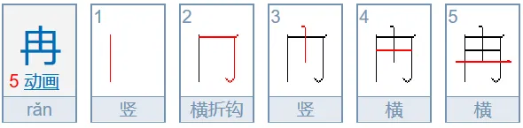 冉(再、苒)笔顺:竖、横折钩、中竖、末笔写二