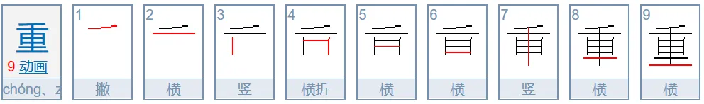 重(踵、董)笔顺:撇、横、写曰,中竖、再写二