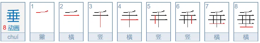 垂(捶、棰、锤)笔顺:先写千、后写艹,再写二