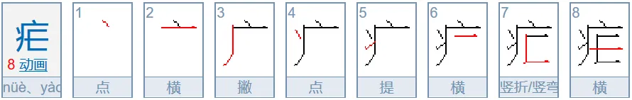 中横向左都出头—疟、虐(谑)末笔笔顺:横、竖折、中横
