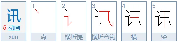 讯的右旁(汛、讯、迅)—笔顺:横折弯钩、横、竖。(末二笔为十)