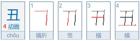 丑(扭、纽、钮—笔顺:横折、竖、横、横(末二笔为二)