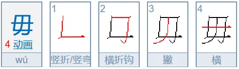 毋(wú)笔顺:竖折、横折钩,[先]撇、[后]横(两边出头)