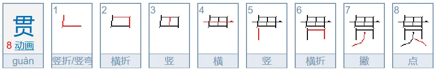 贯的上部笔顺:竖折、横折、[先]竖、[后]横(两边出头)