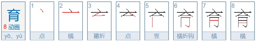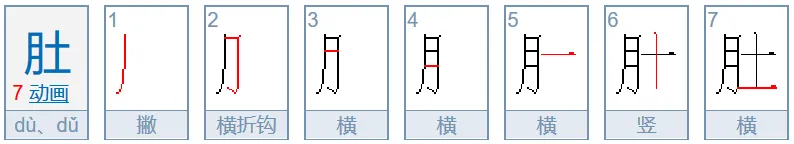 育、肯、胃、有、肩:月在下,首笔为竖