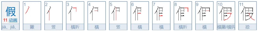 假、暇、遐(霞)—中间部件前三笔笔顺:横折、横、竖