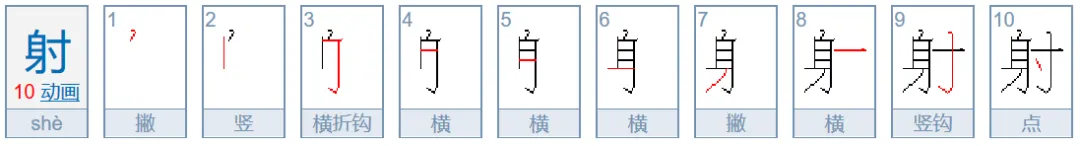 身(射、躬、躲)—第六笔横、第七笔撇,都向右不出头