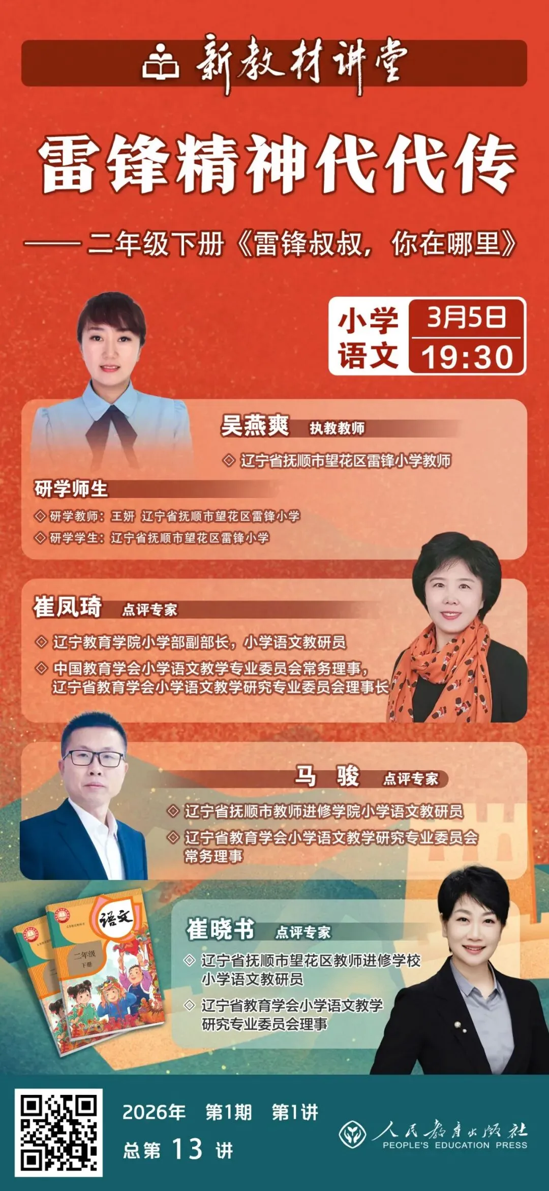 3月5日周四19:30,2026年“新教材讲堂”第1期第1讲(总第13讲)来了!本讲主题为“雷锋精神代代传——二年级下册《雷锋叔叔,你在哪里》”。让我们走进辽宁省抚顺市雷锋小学,探访雷锋班、雷锋纪念馆,重读《雷锋日记》,一同寻找雷锋足迹,汲取榜样力量,让永不褪色的雷锋精神代代相传、生生不息。敬请关注!