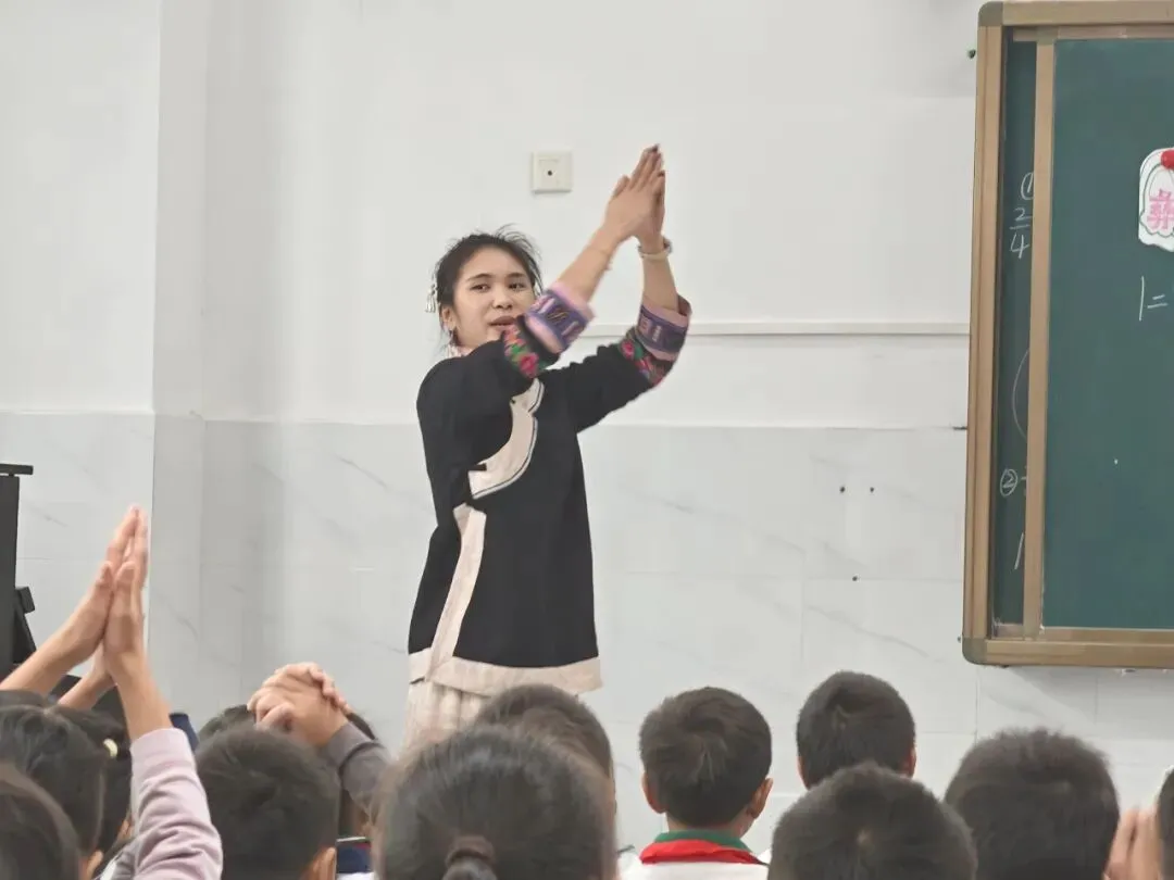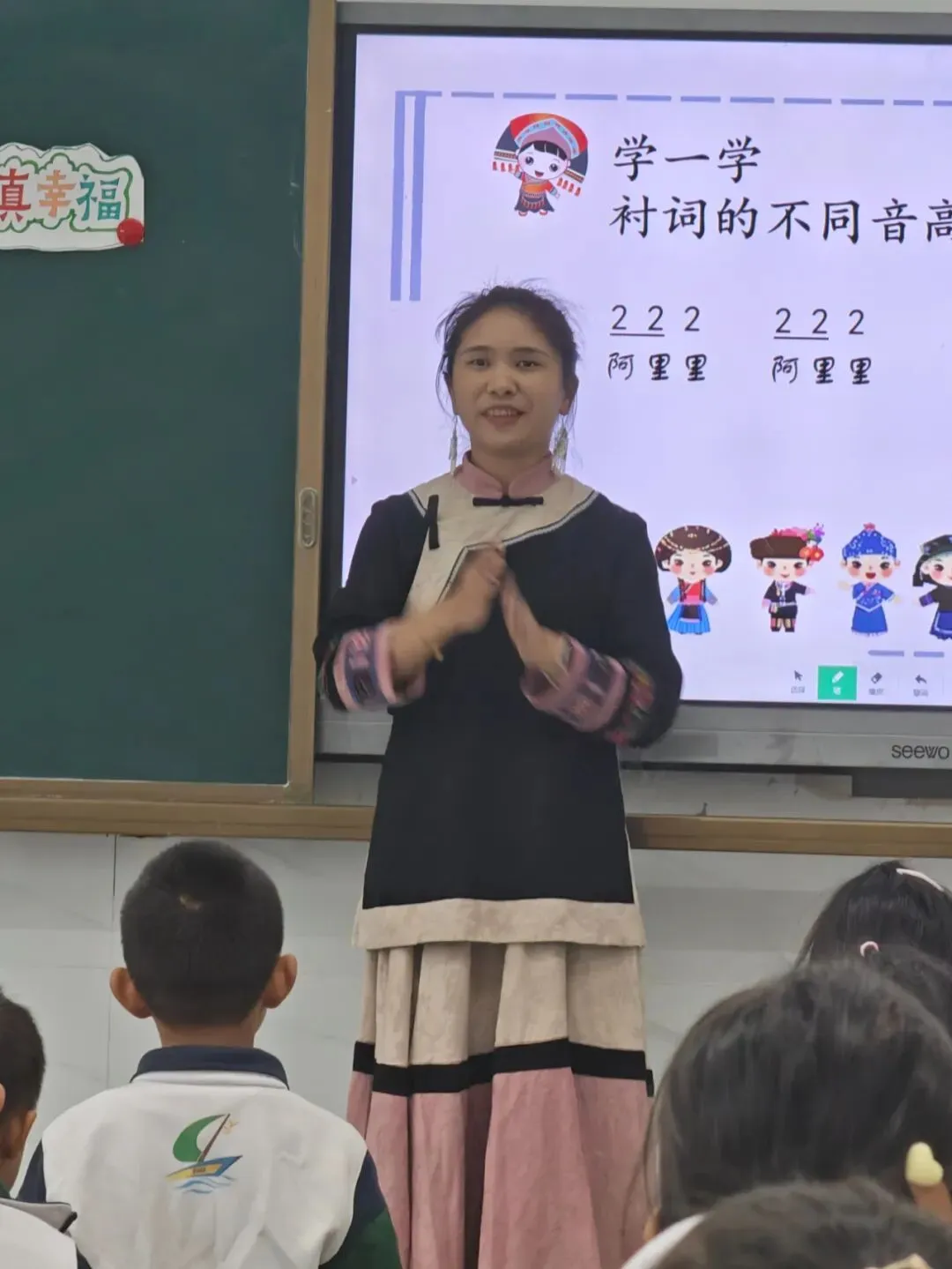 李荣娜老师身着彝族服装,伴随着热情洋溢的音乐律动走进教室,轻松地将孩子们带入民族音乐的氛围中。李老师针对特殊孩子的学情特点,采用了情境导入,通过图片、视频等引导学生了解彝族相关文化背景、服饰、刺绣以及火把节等民族特色风情,激发学生学习的兴趣。通过用打击乐器伴奏,逐步加入身势律动等环节使同学们进一步融入到课堂活动中,深深地沉浸在音乐的海洋里,感受民歌的特有韵味,领略音乐的艺术魅力。