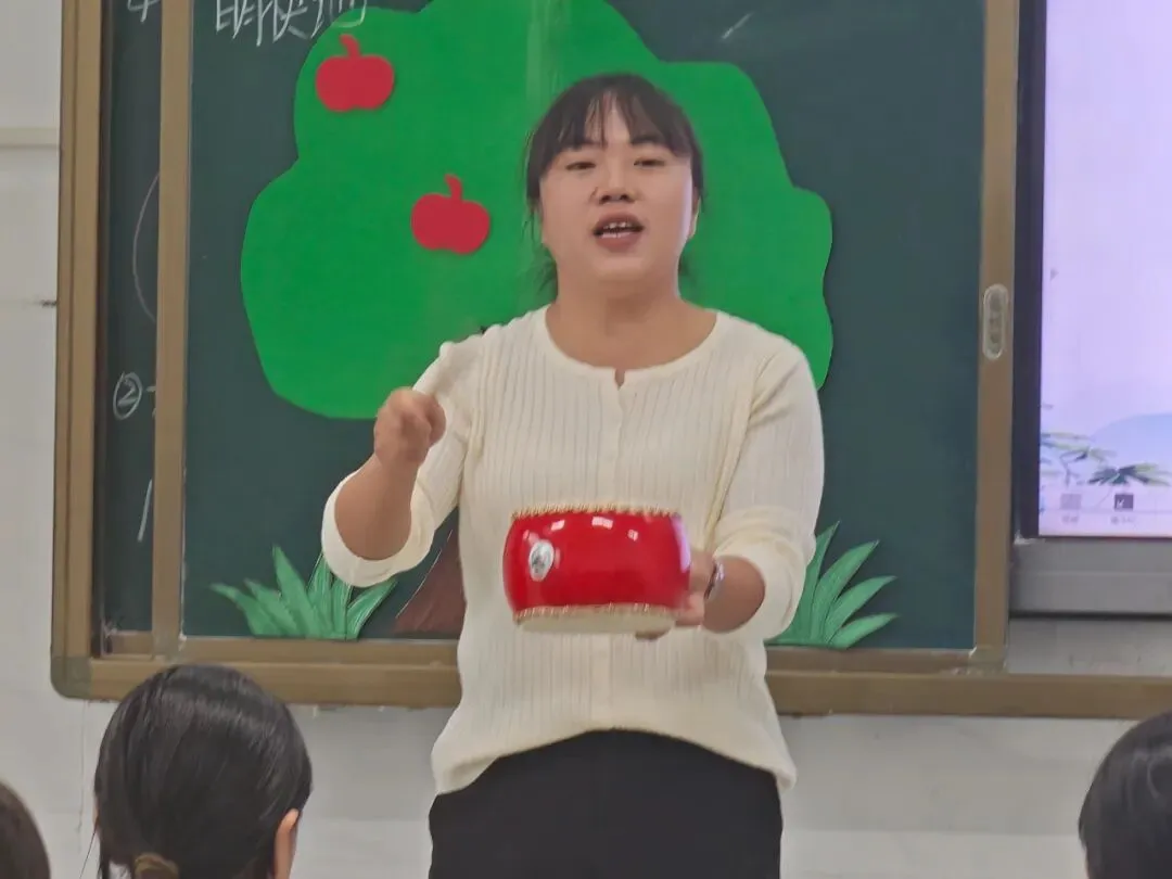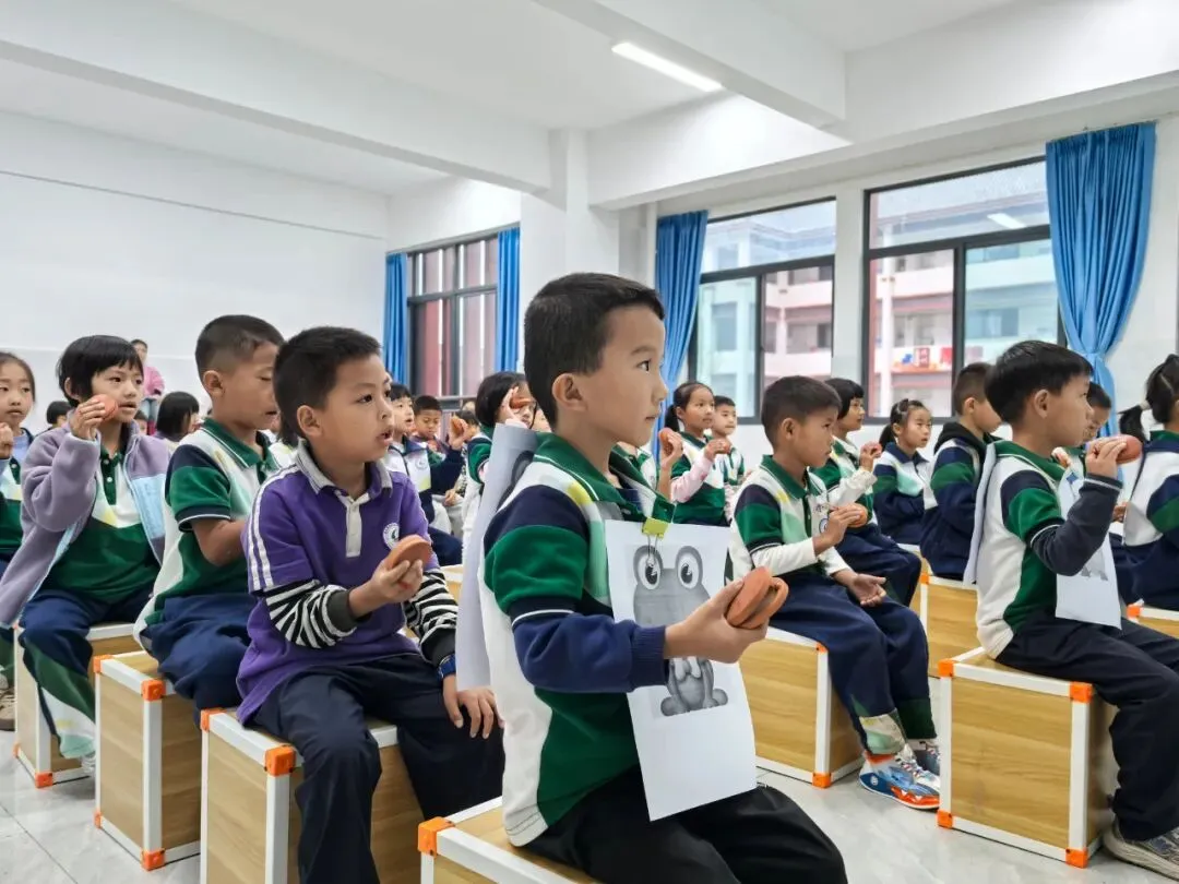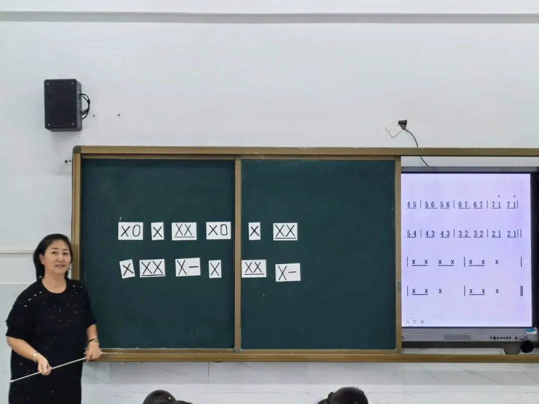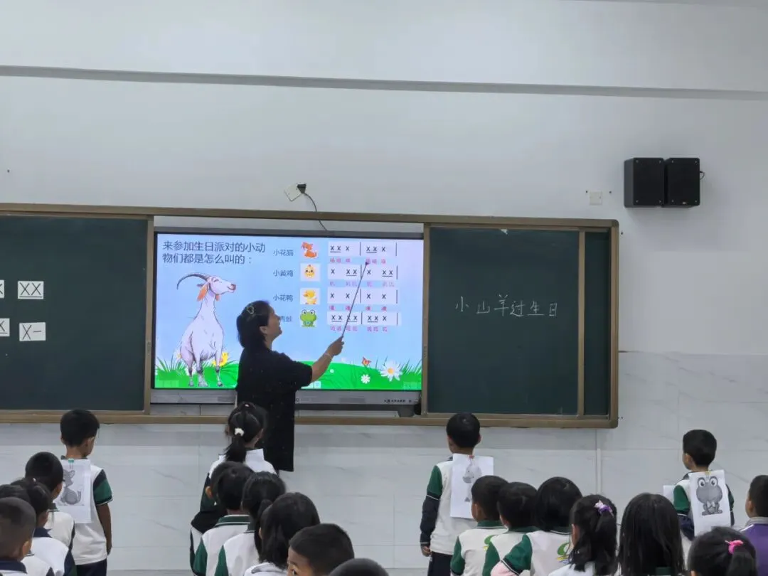 况丽老师与一年级孩子共同演绎了一场生动有趣的音乐游戏课——《小山羊过生日》。《小山羊过生日》是人音版教材一年级上册第四单元《可爱的动物》中两首音乐游戏中的其中一首,该歌曲是新教材中的新增内容。本课无旋律,况老师要求学生在给固定歌词的情况下,念一念歌词,用小乐器响板奏一奏节奏;借助小花猫、小黄鸡、小花鸭、小青蛙和小山羊的叫声,进行四分音符和八分音符节奏整合,同时学习二分音符。让学生在小动物活泼可爱的叫声中,熟练掌握节奏型,使孩子们在愉快的游戏活动中学习知识。