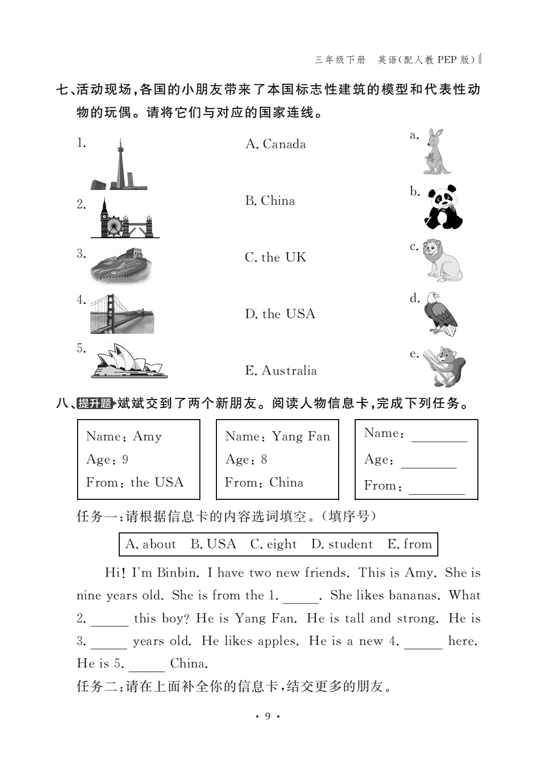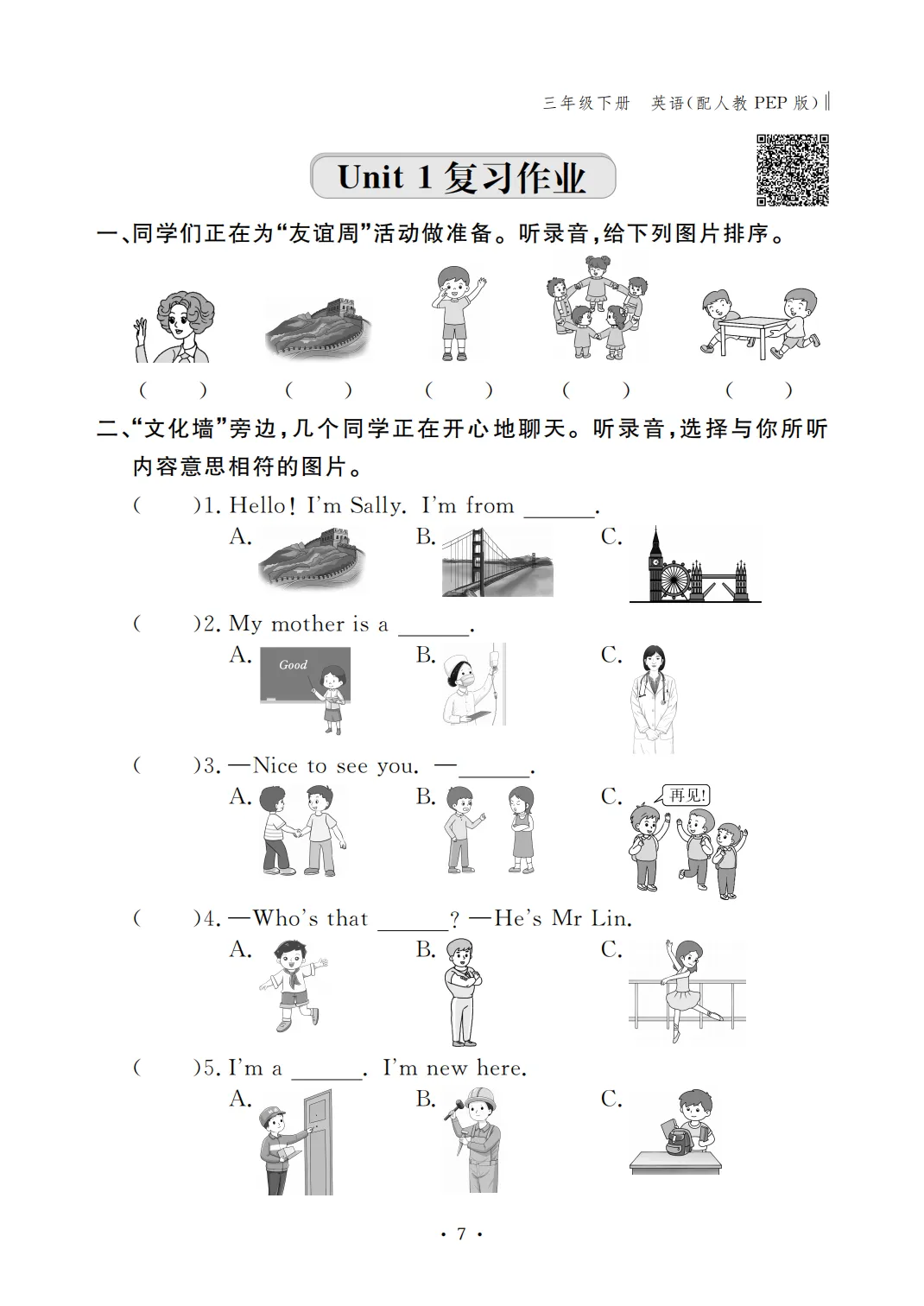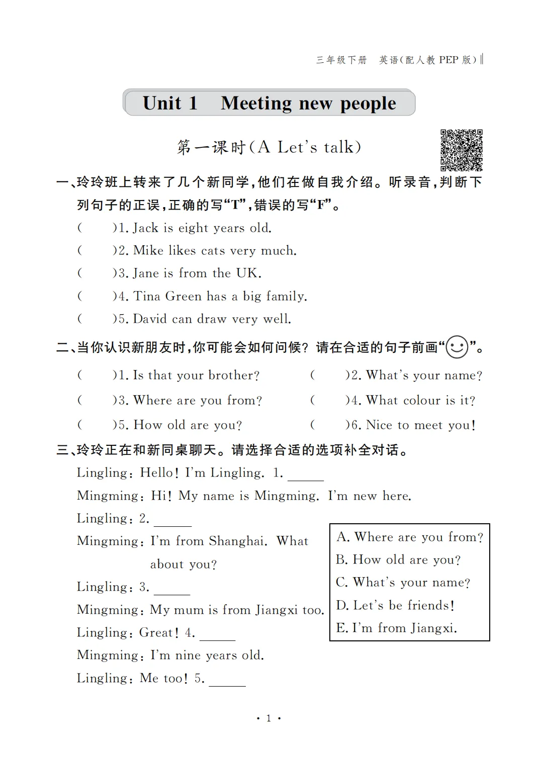 PEP人教版新教材小学英语三年级下册作业本配套听力U1 Meeting new people