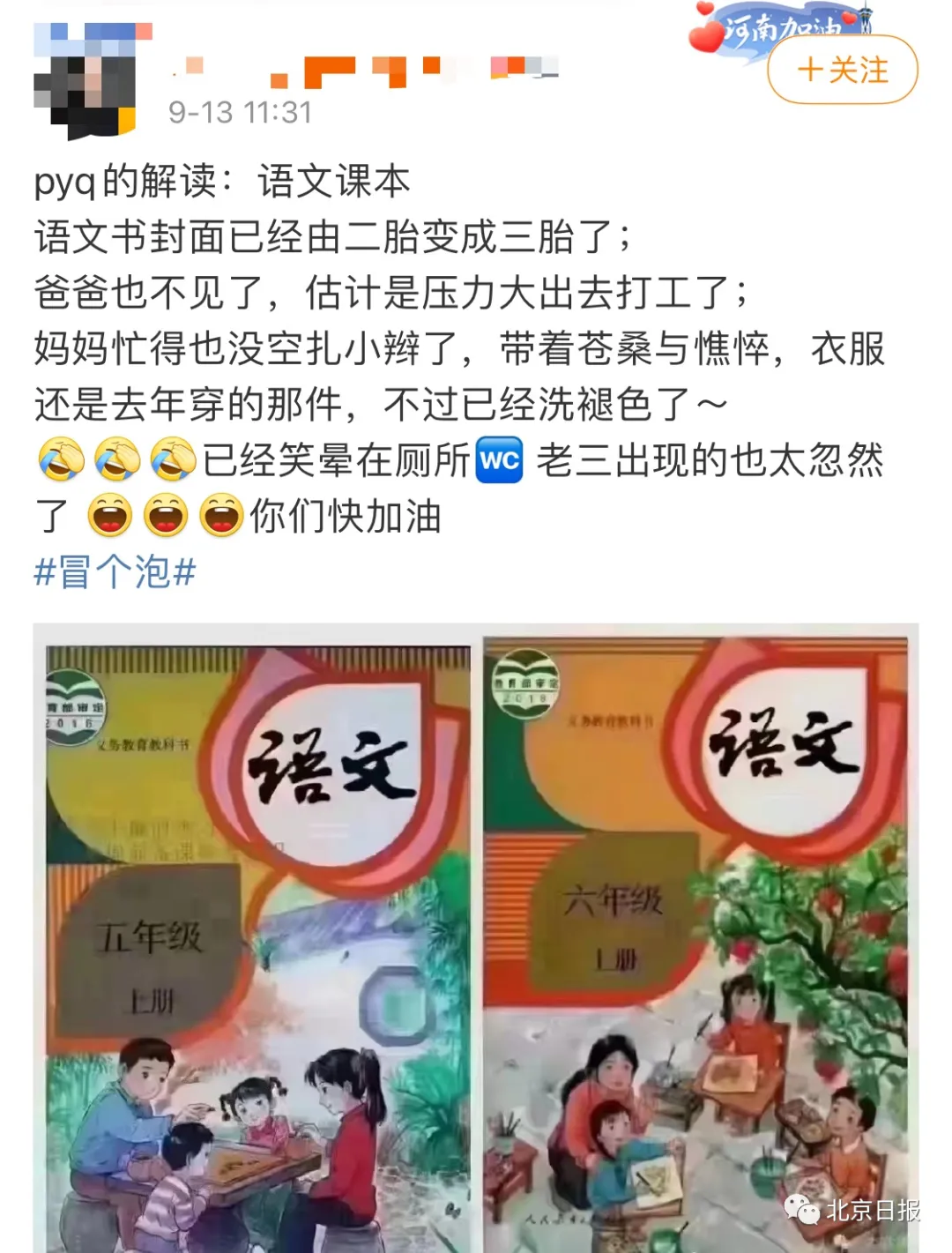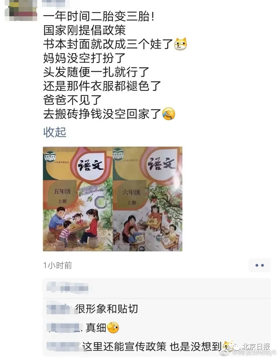 不过,在“三胎”的社会热点下,网友这样的联想也很能理解,毕竟刚拿到新课本的第一刻、第一眼,肯定看的就是封面,而封面图怎么设计,其实是件非常讲究的事。