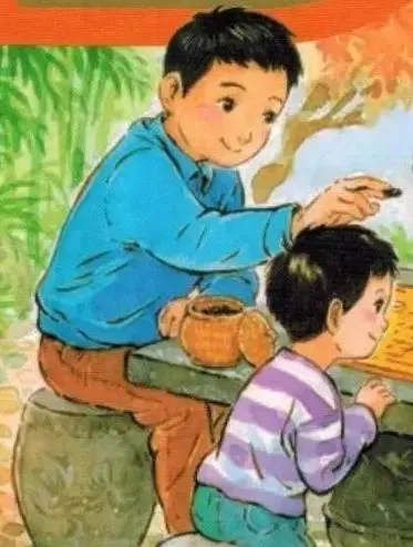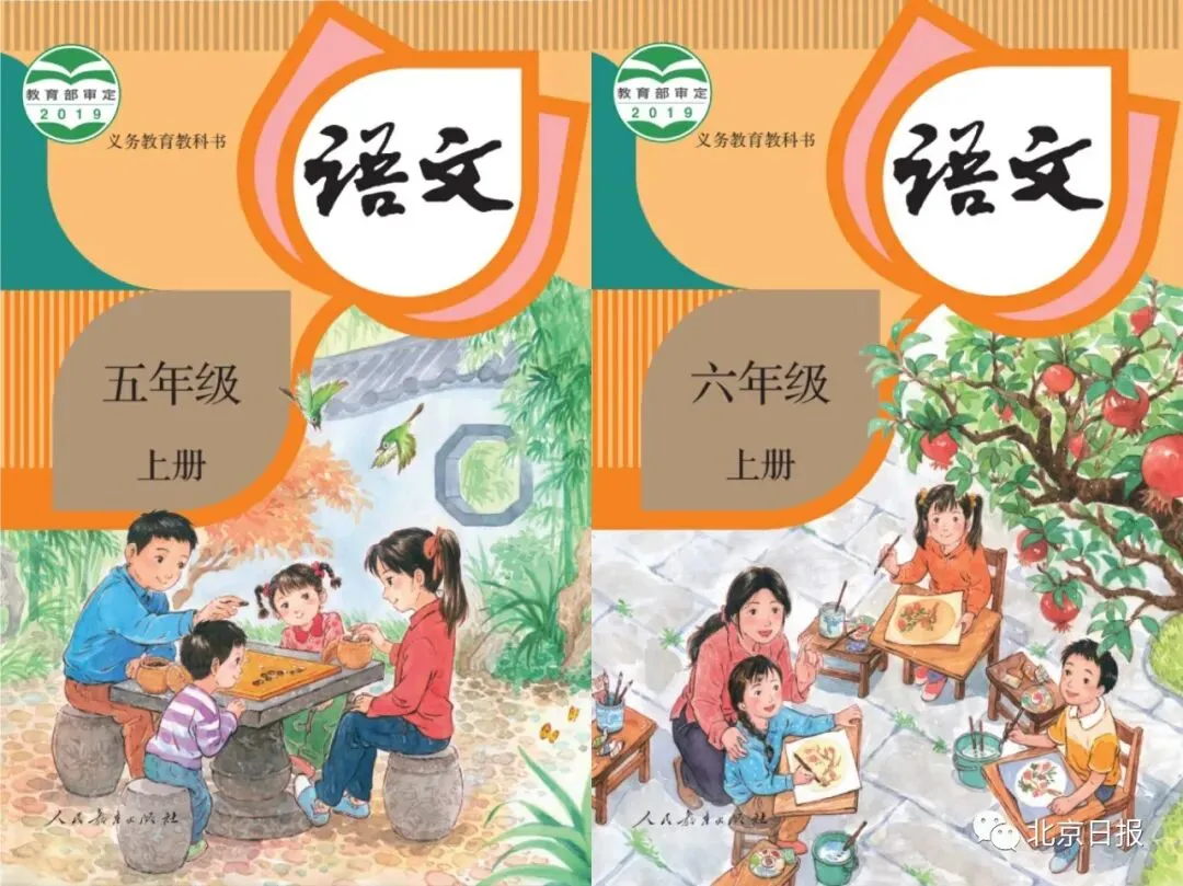 比如,五年级上册语文课本的封面上,四个孩子围坐在石桌旁下着围棋;六年级上册的封面上,孩子们正在进行国画写生。