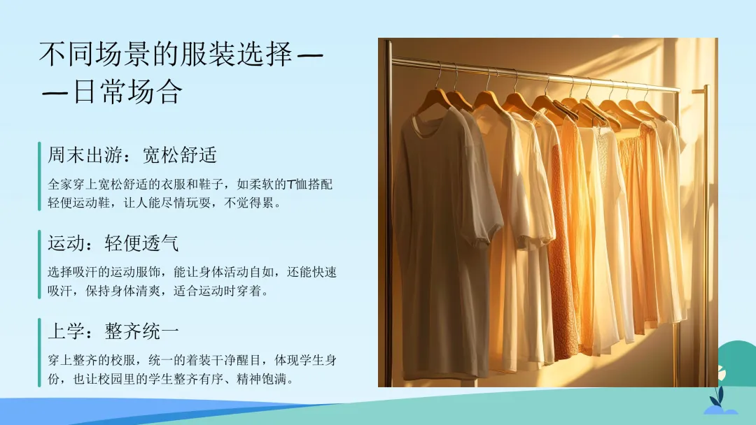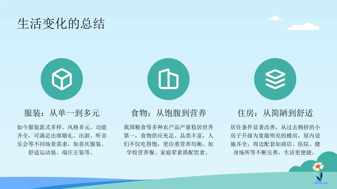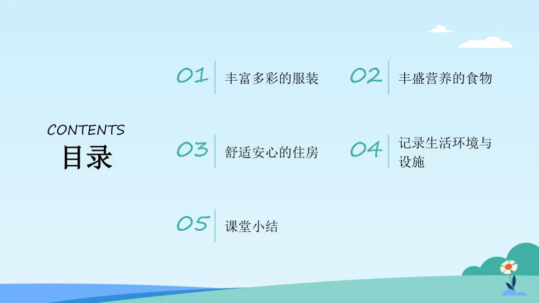 • 重点:感知服装、食物、住房的变化,了解不同场景的服装选择、我国食物供应的特点及居住条件的改善。