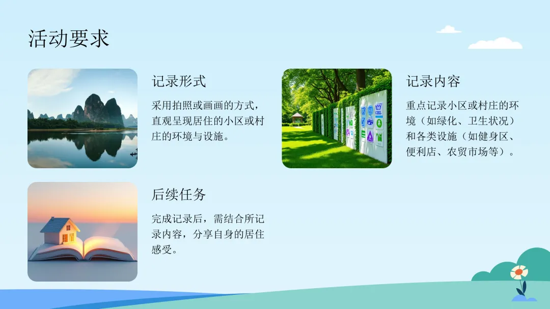 • 实践材料:画纸、画笔(供学生记录生活环境与设施使用)。