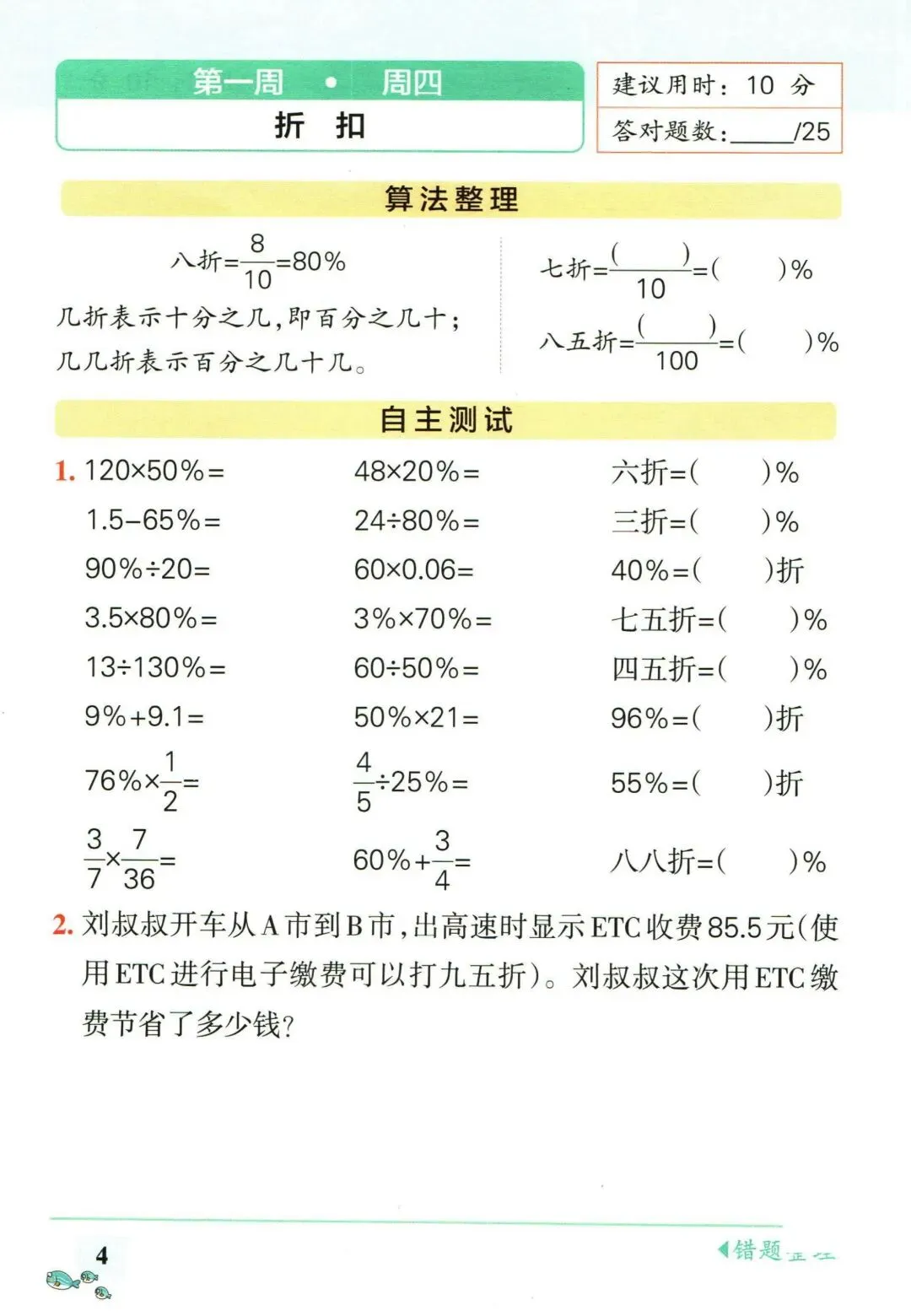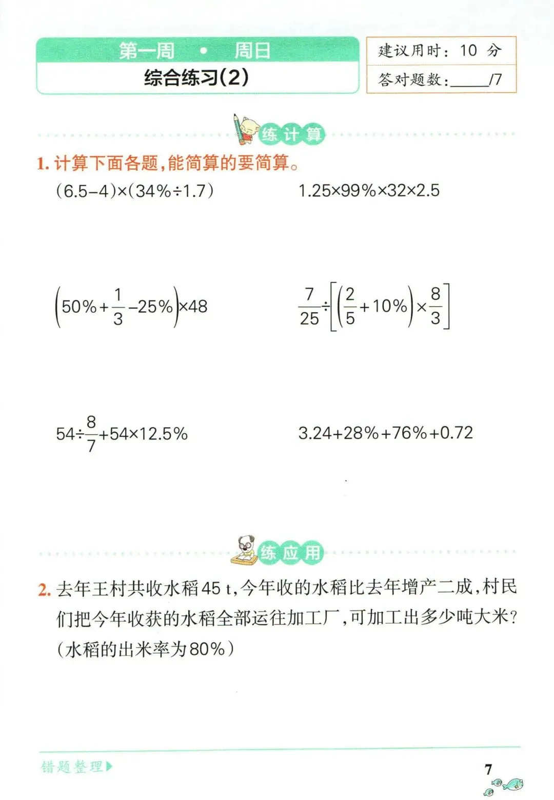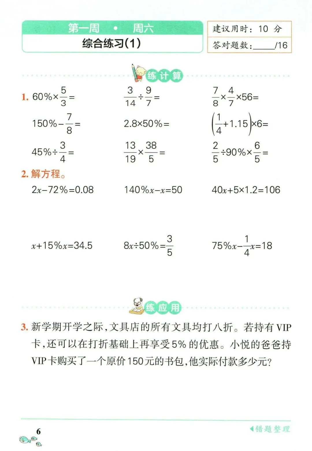 小学学霸天天计算六年级下册人教版-同步教材,电子版可打印