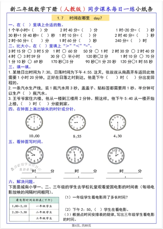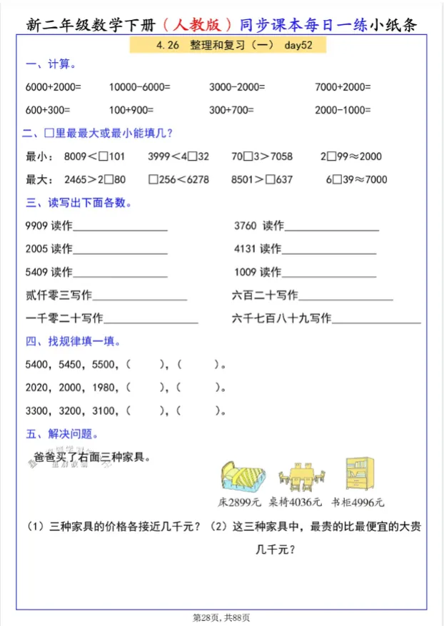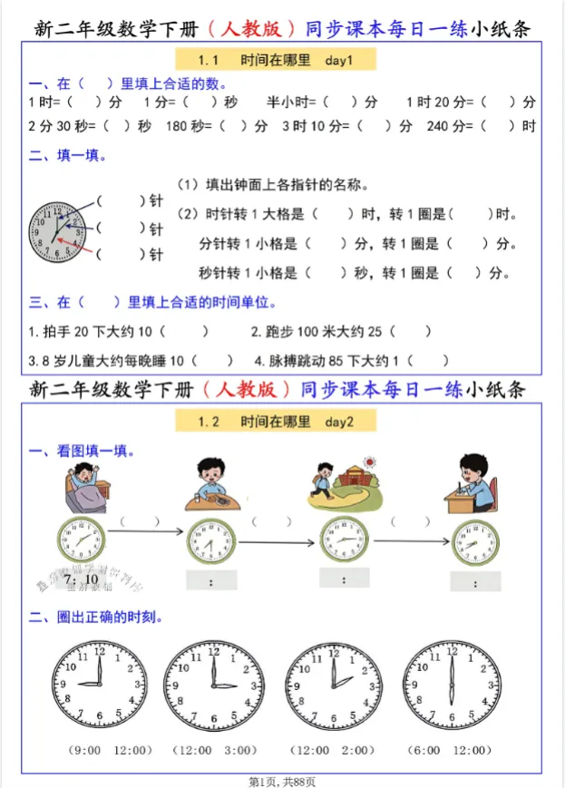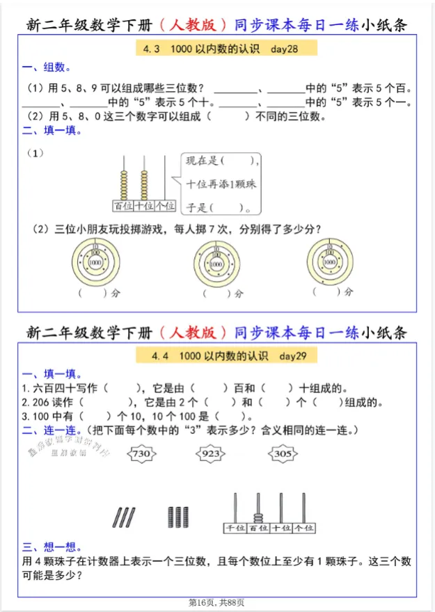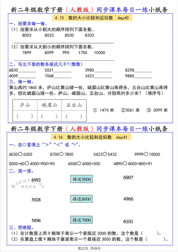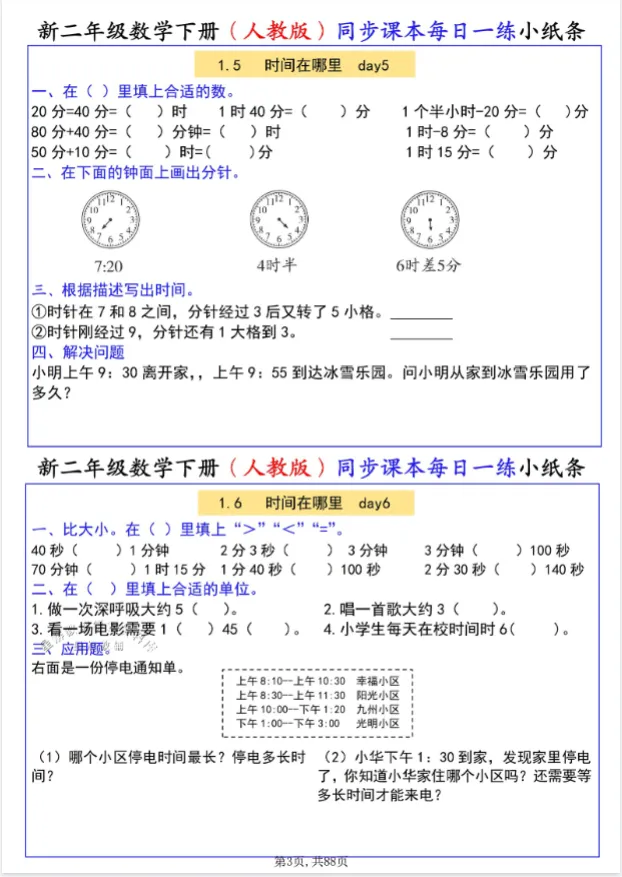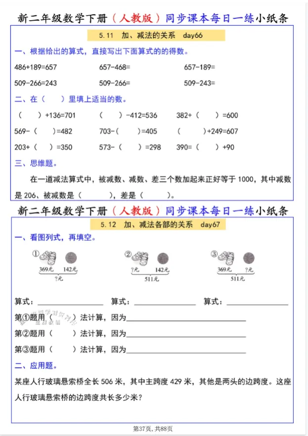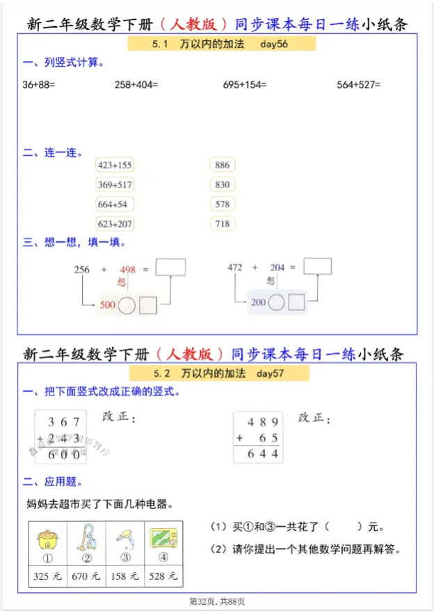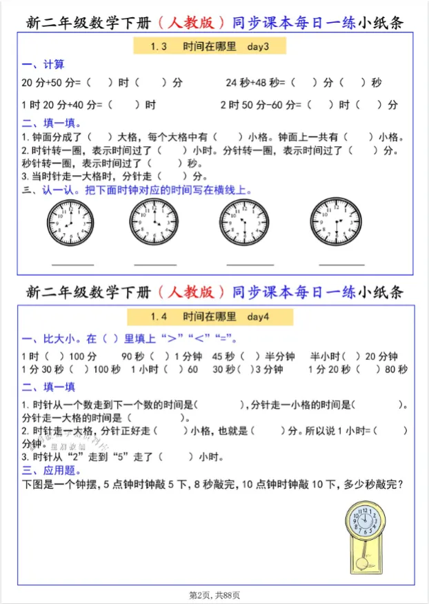 2026春人教版小学二年级下册数学同步课本计算口算每日一练小纸条(含答案共88页)