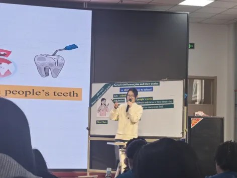 区三实验小学李丽娟老师执教第二课时“Different jobs and their duties”,以牙医职业为切入点,通过趣味chant、任务单填写、角色扮演等形式,让学生了解牙医“检查牙齿、填补牙洞、提供护牙建议”等职责,学会用英语表达“应做与不应做”的行为规范,课堂互动生动高效;