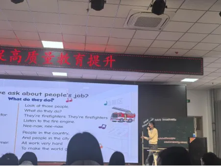 桃南小学贺鹏珍老师执教第一课时“Different jobs around us”,以“职业体验馆”为情境载体,通过看、听、说、配对等活动,引导学生认识医生、消防员、农民等职业,掌握职业名称及相关表达,注重基础语言能力的扎实培养;