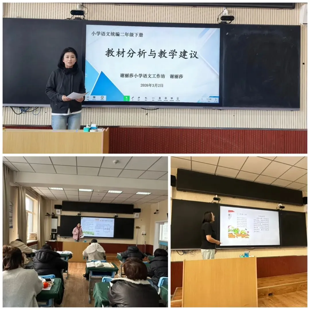 为深入理解教材编写理念,精准把握教学方向,全面提升全旗小学语文教师专业素养,2026年3月2日全旗教材培训活动顺利开展。谢丽莎小学语文工作坊承担1—3年级语文专场培训任务,乔曼飞、谢丽莎、塔娜老师分别围绕一年级、二年级、三年级语文教材的编排特点与教学建议进行专题解读与分享。