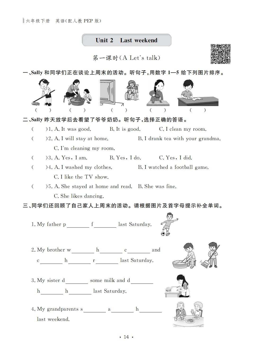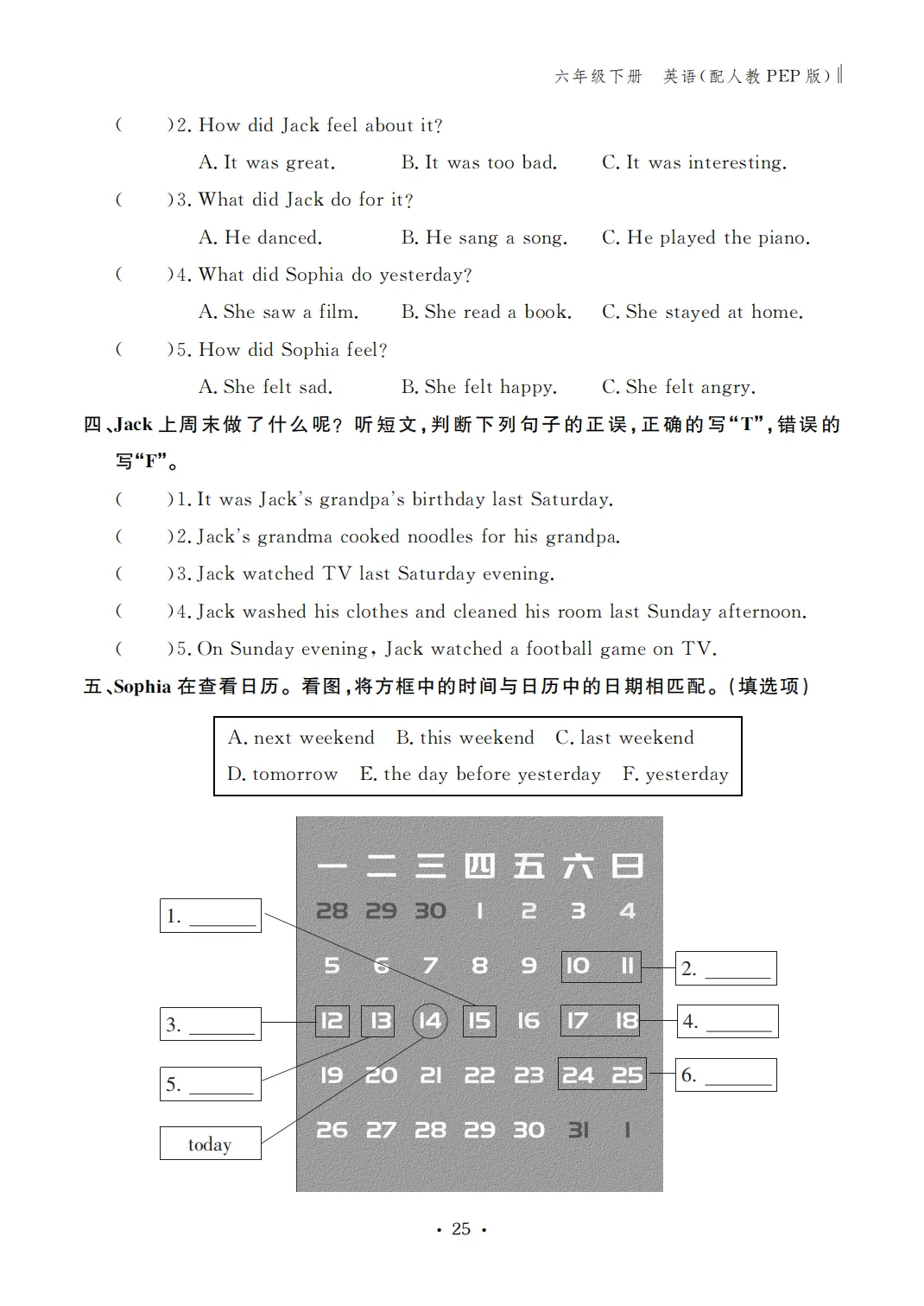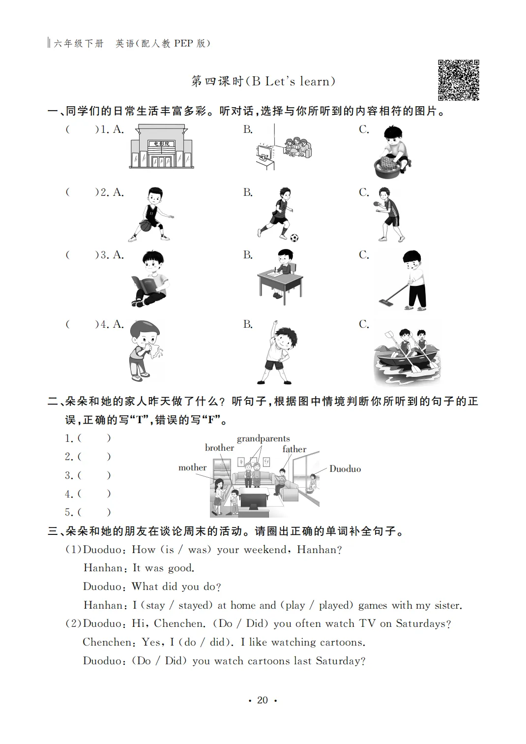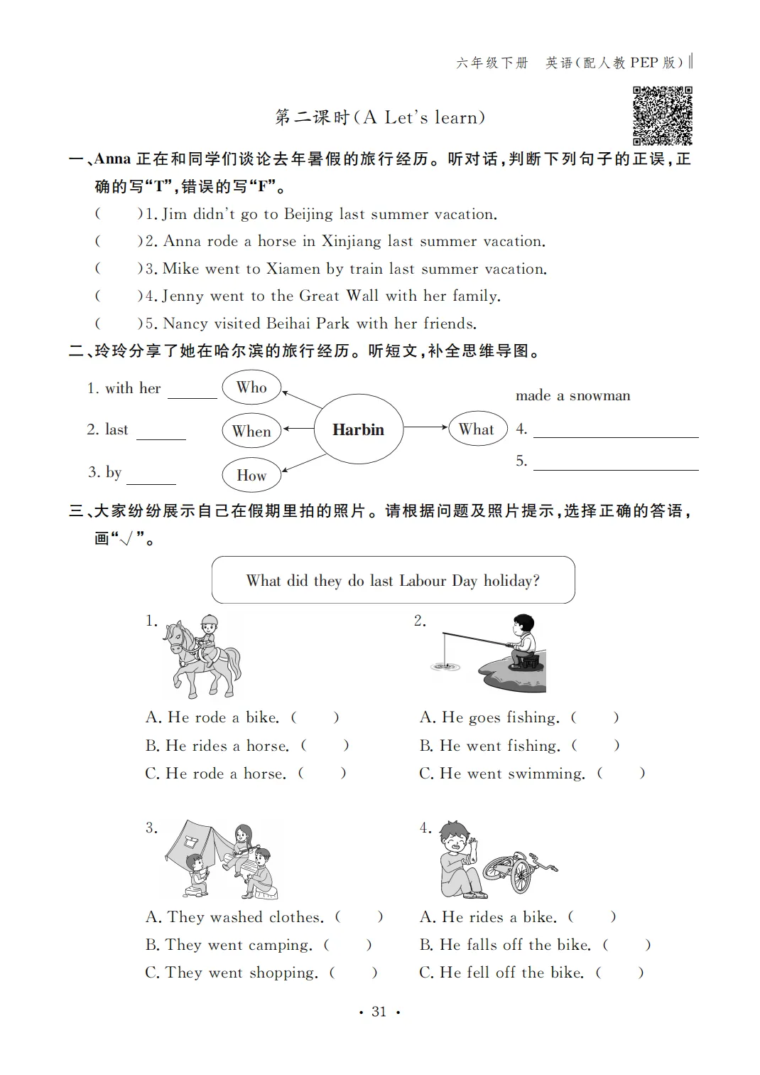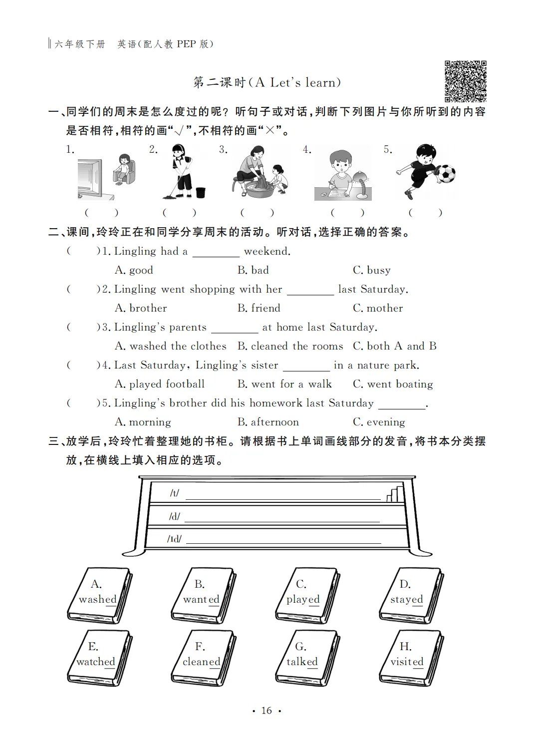 PEP人教版新教材小学英语六年级下册作业本配套听力U2 Last week