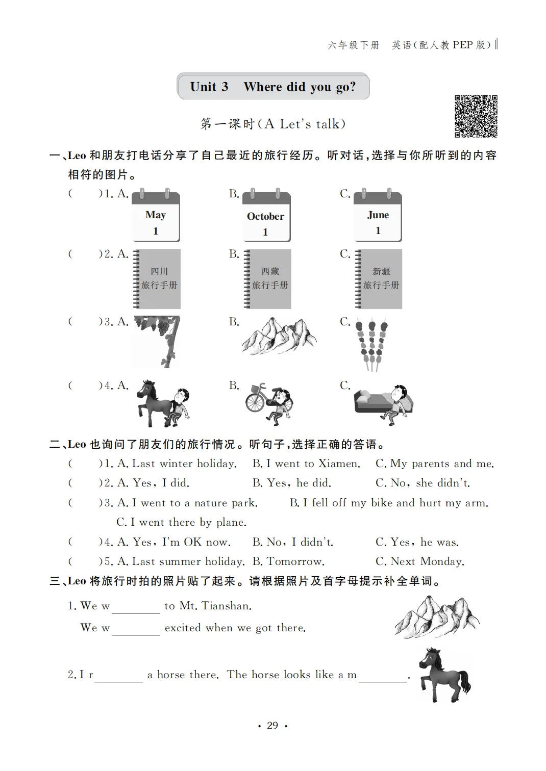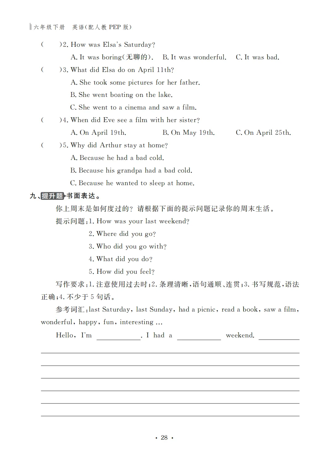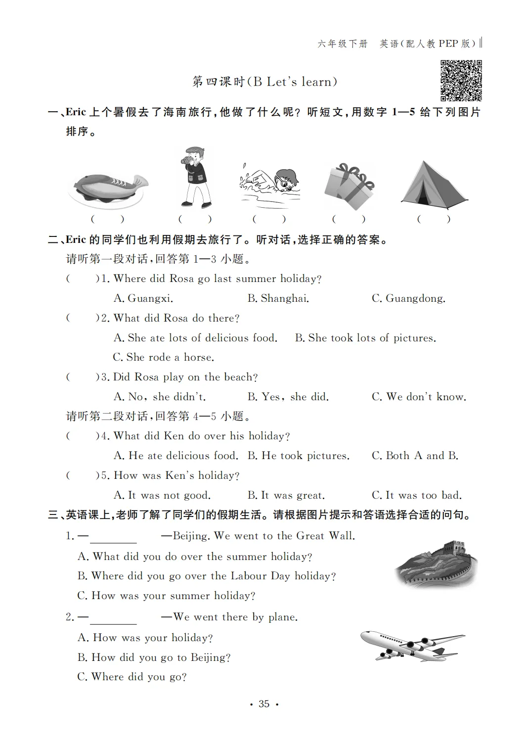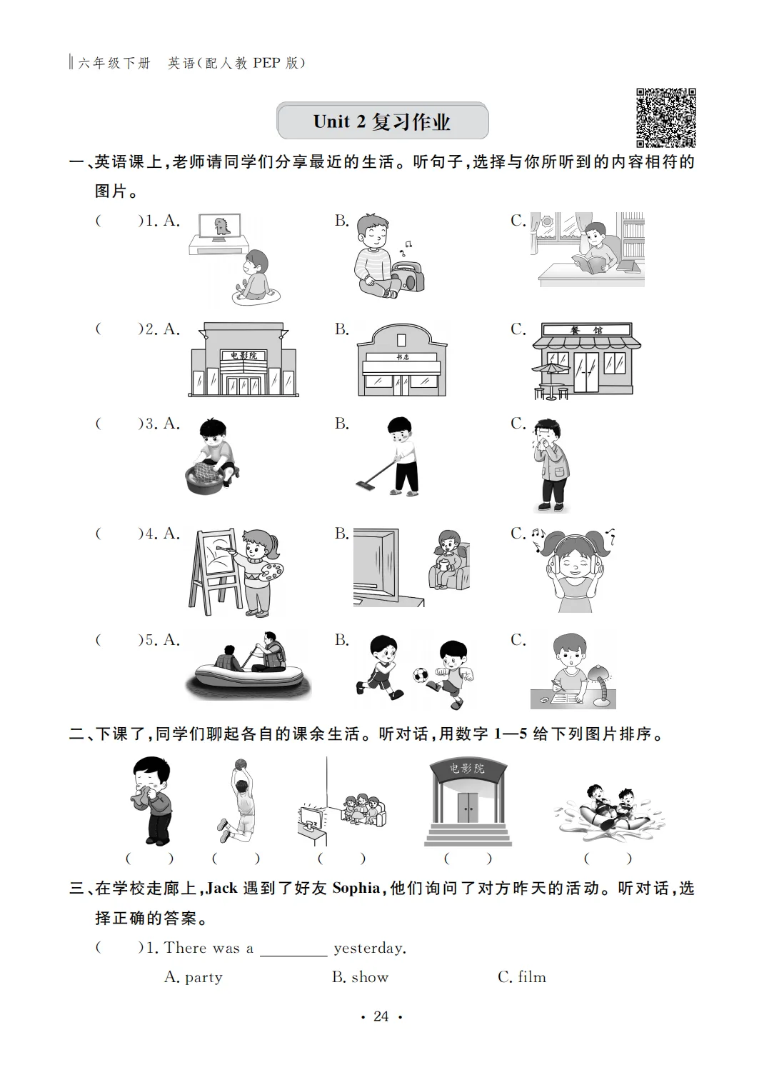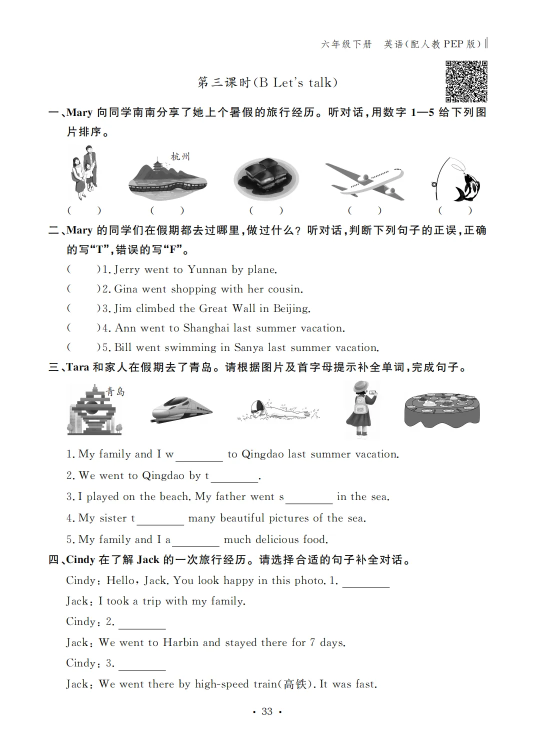 PEP人教版新教材小学英语六年级下册作业本配套听力U2 Last week