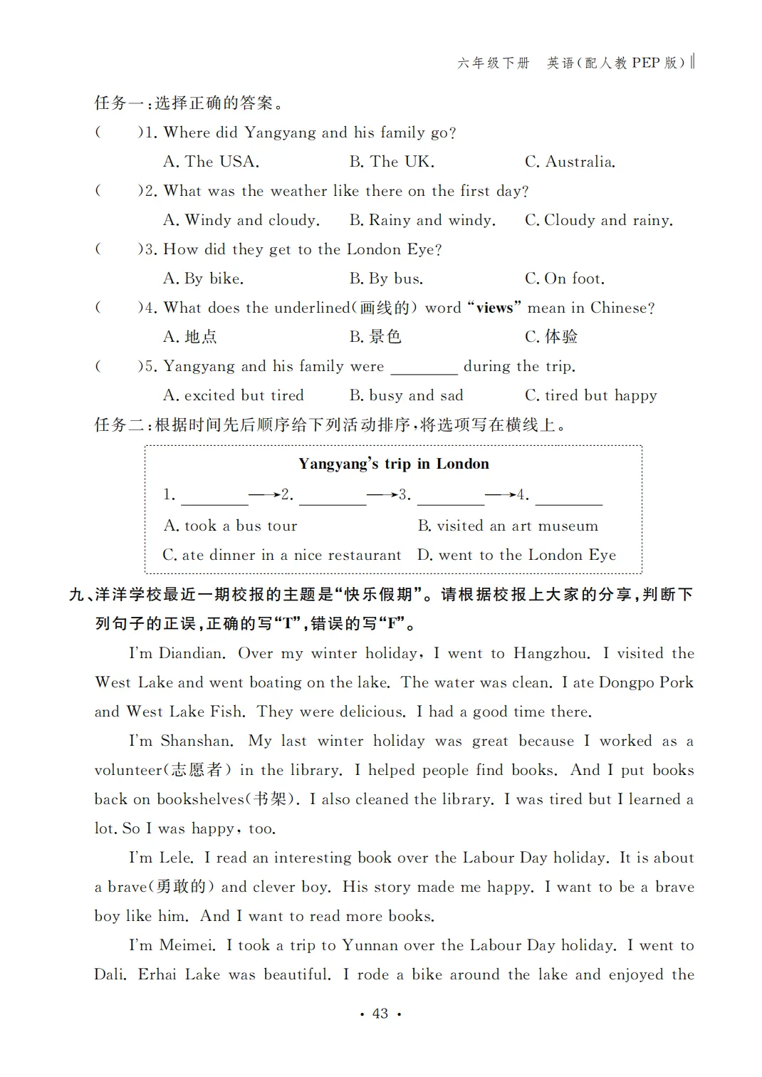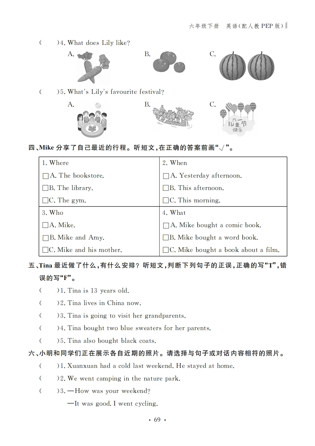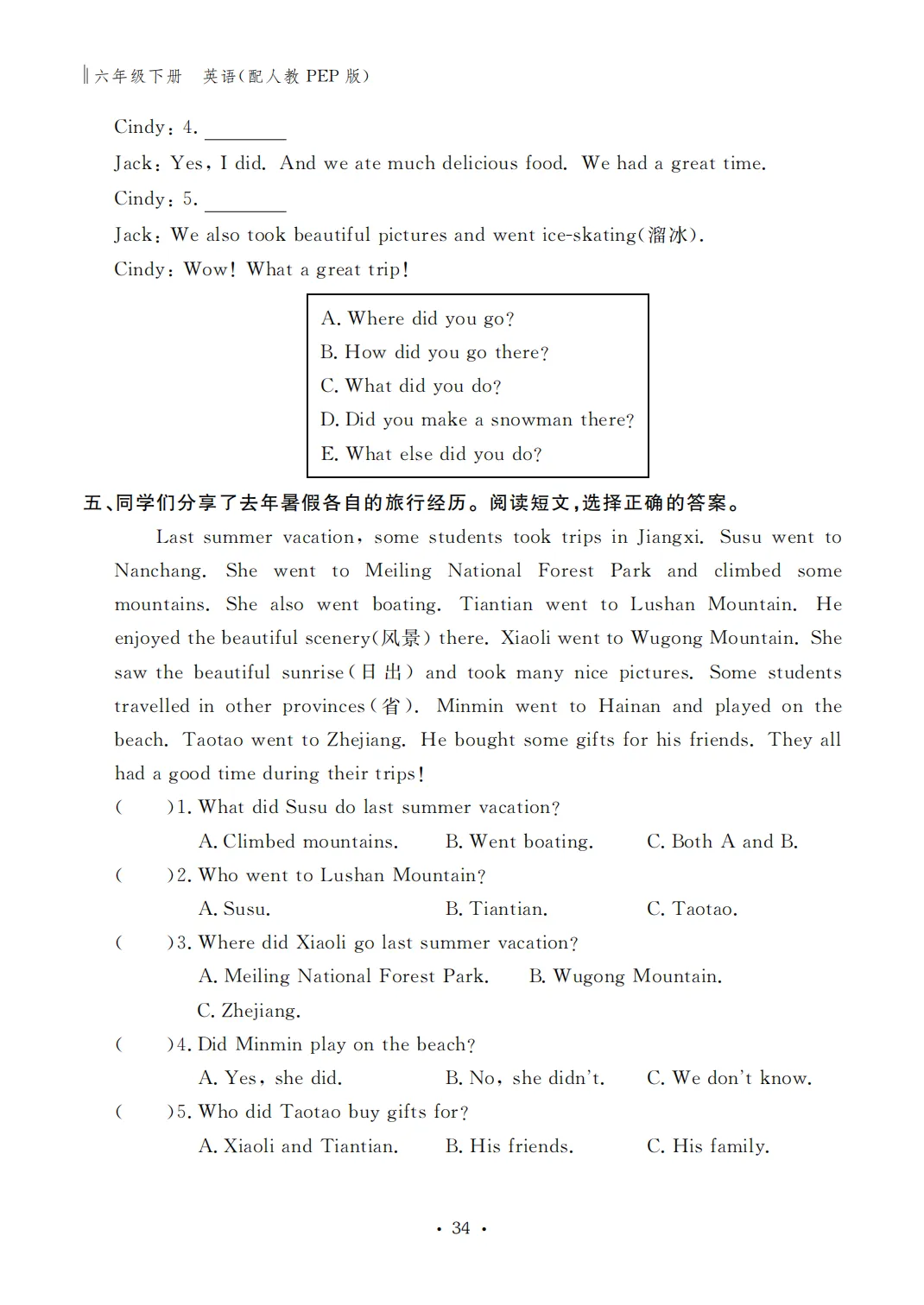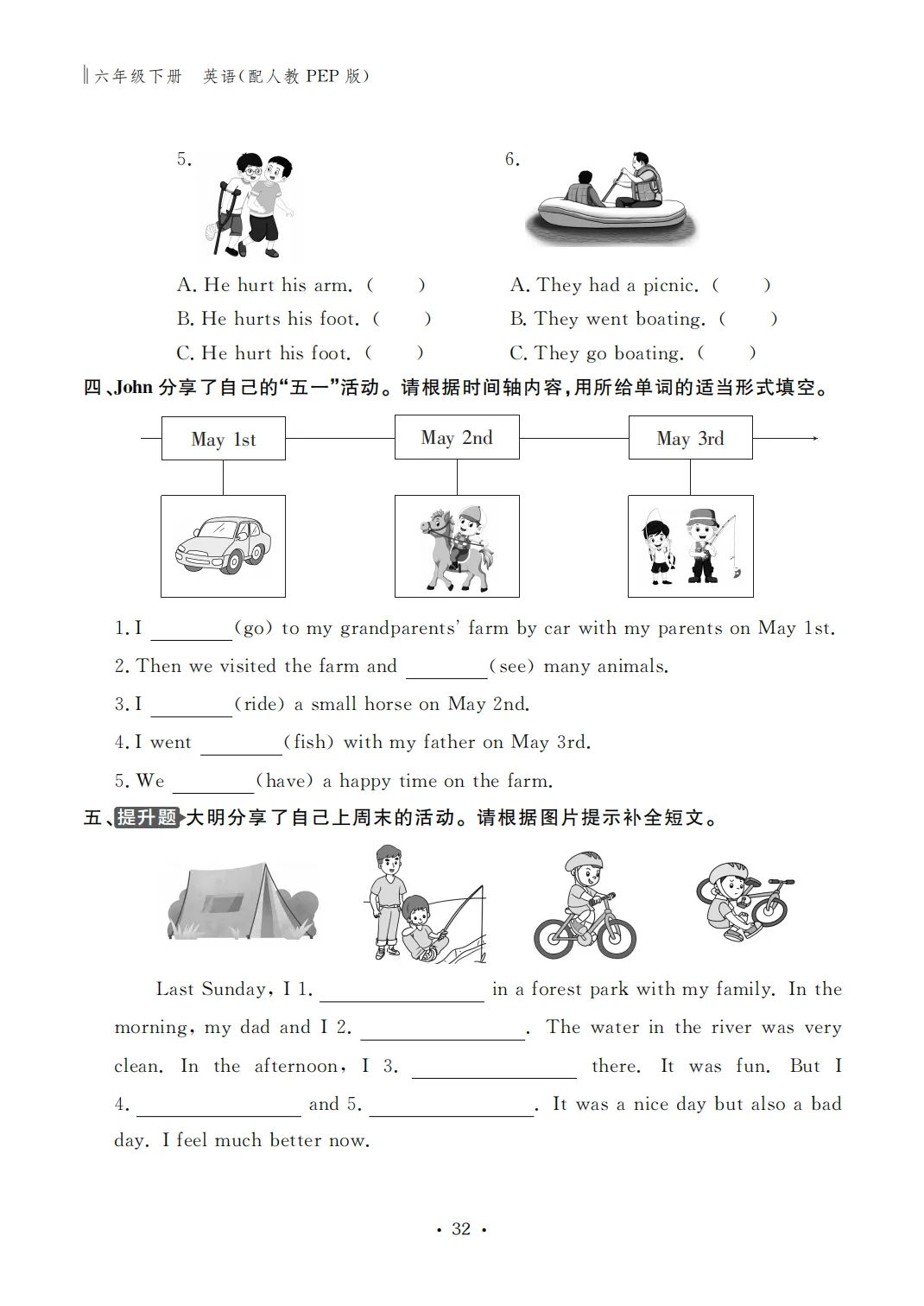 PEP人教版新教材小学英语六年级下册作业本配套听力U2 Last week