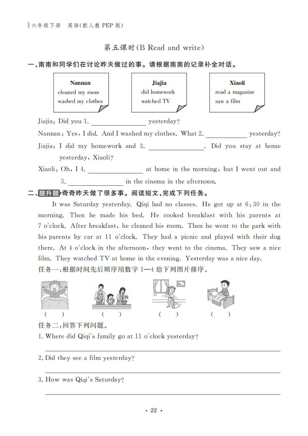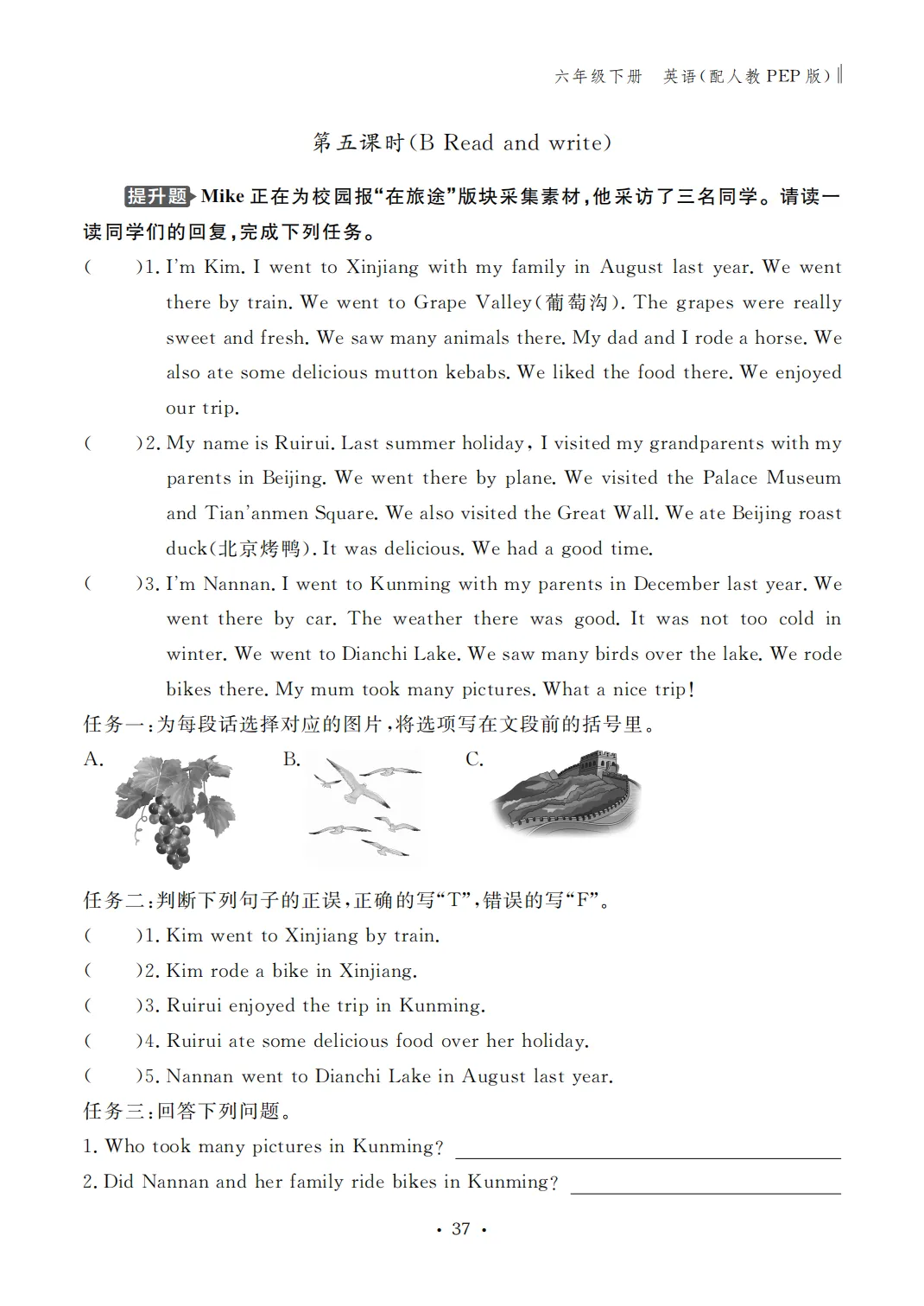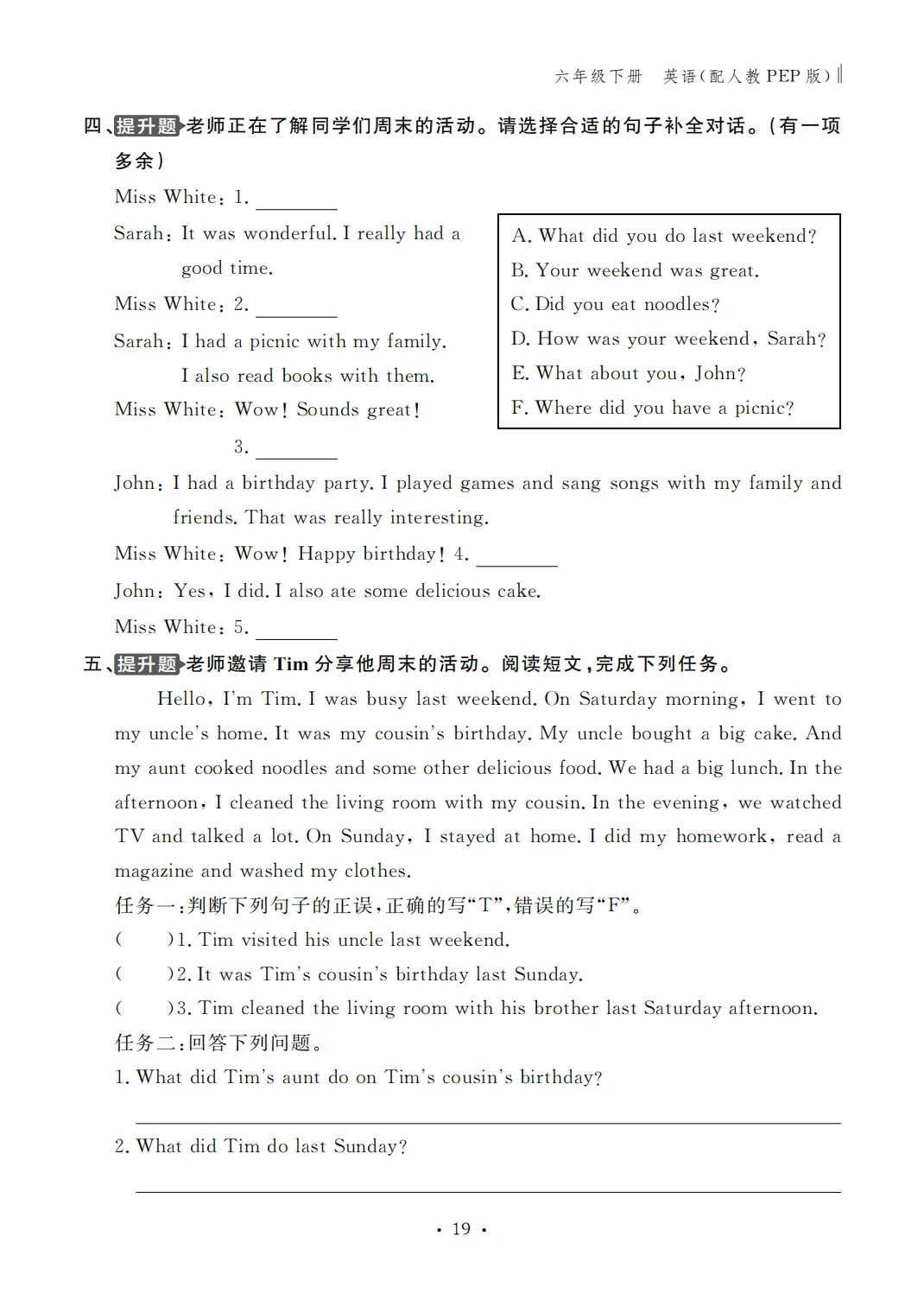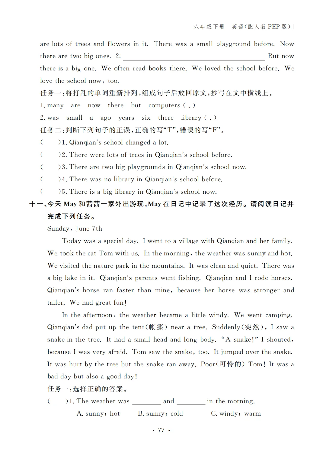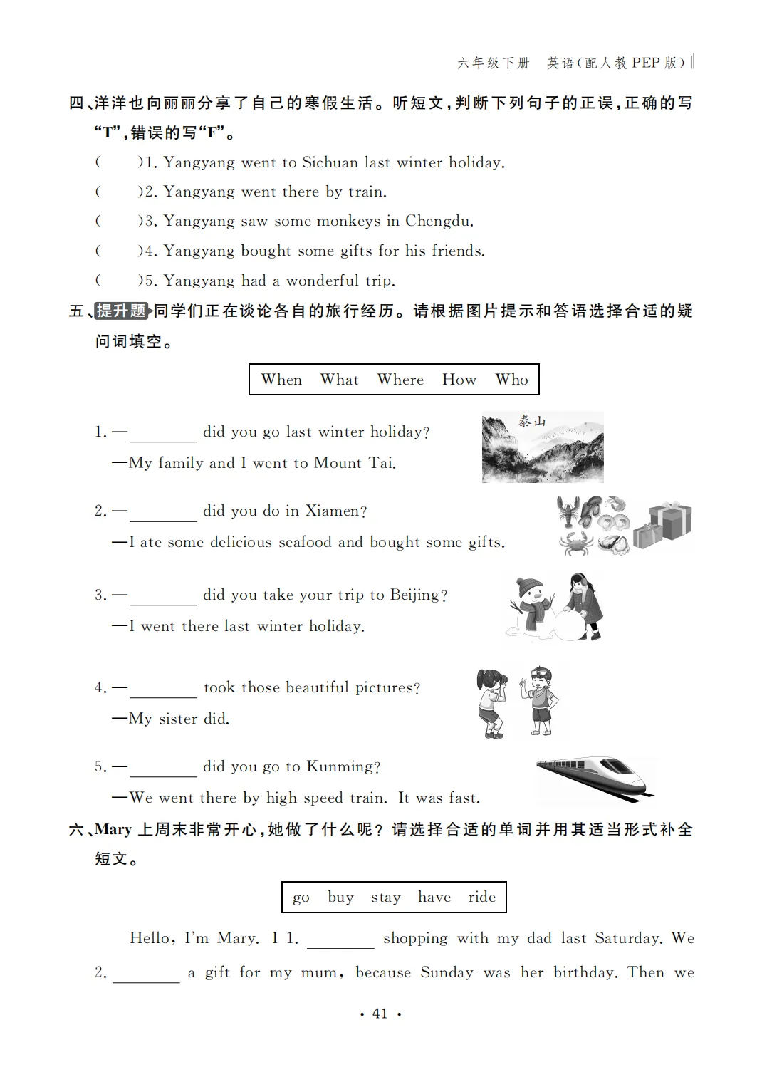 PEP人教版新教材小学英语六年级下册作业本配套听力U2 Last week