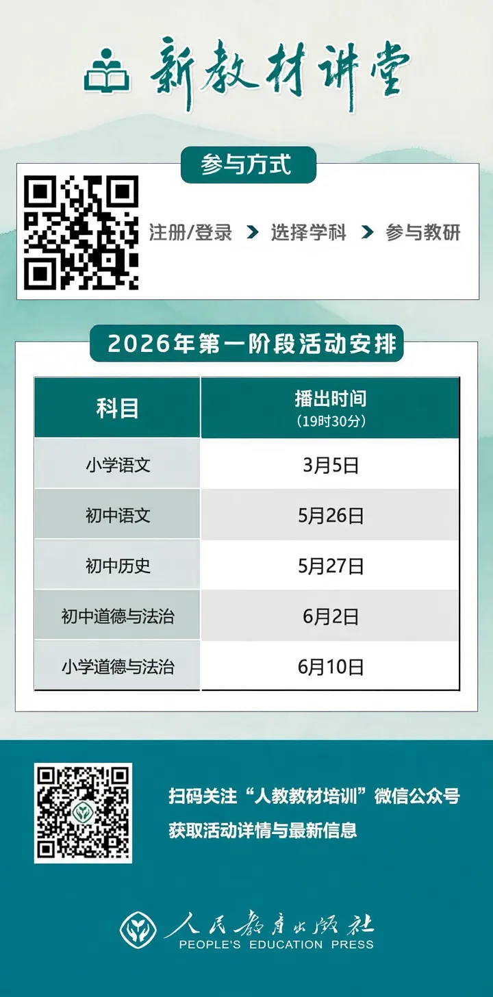3月5日周四19:30,2026年“新教材讲堂”第1期第1讲(总第13讲)来了!本讲主题为“雷锋精神代代传——二年级下册《雷锋叔叔,你在哪里》”。让我们走进辽宁省抚顺市雷锋小学,探访雷锋班、雷锋纪念馆,重读《雷锋日记》,一同寻找雷锋足迹,汲取榜样力量,让永不褪色的雷锋精神代代相传、生生不息。敬请关注!