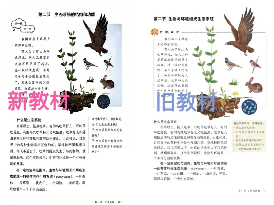 对比维度 | 新教材(八上第五单元第一章第二节《生态系统的结构和功能》p83-p89) | 旧教材(七上第二章第二节《生物与环境组成生态系统p19-p25》) |