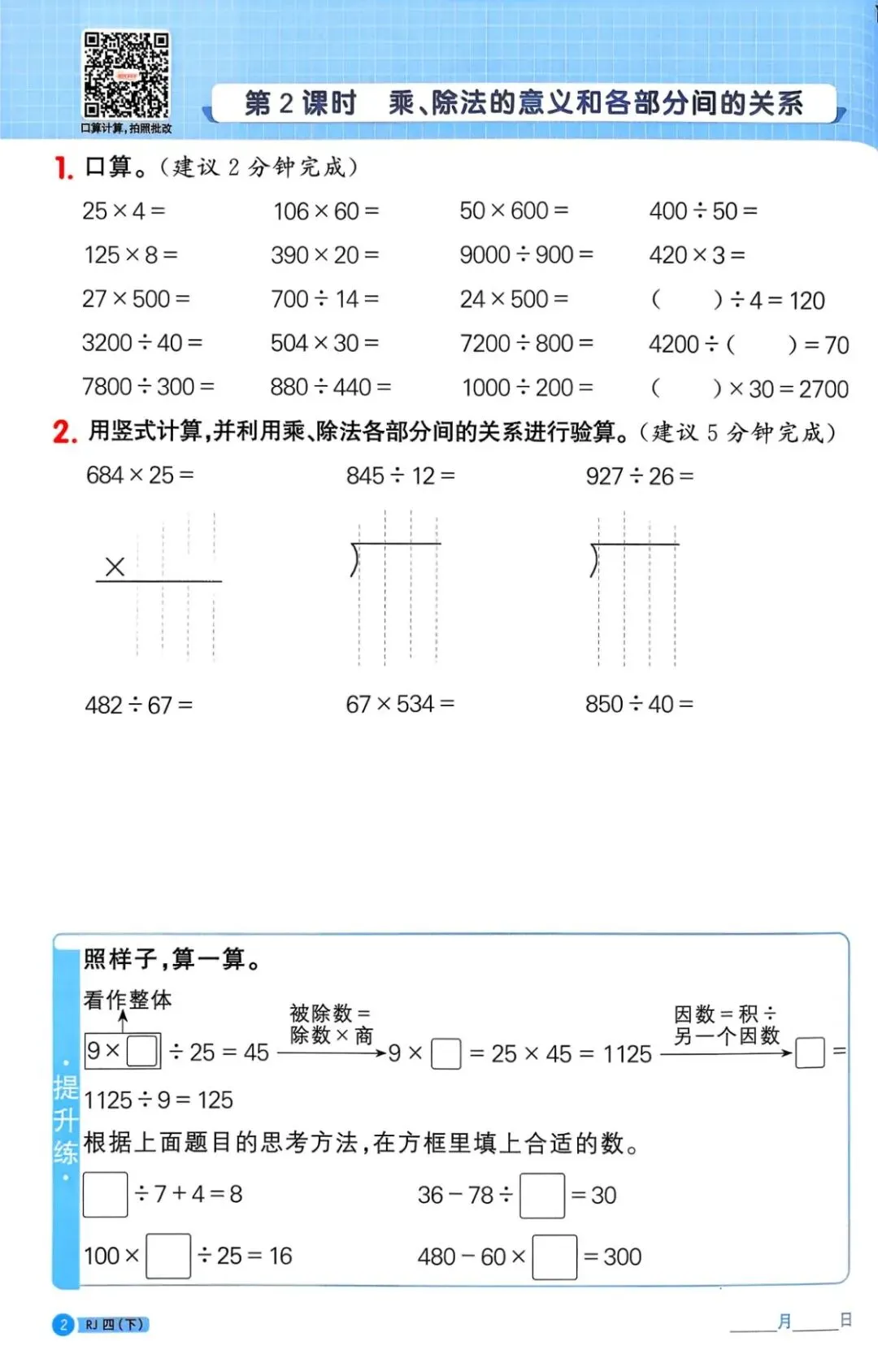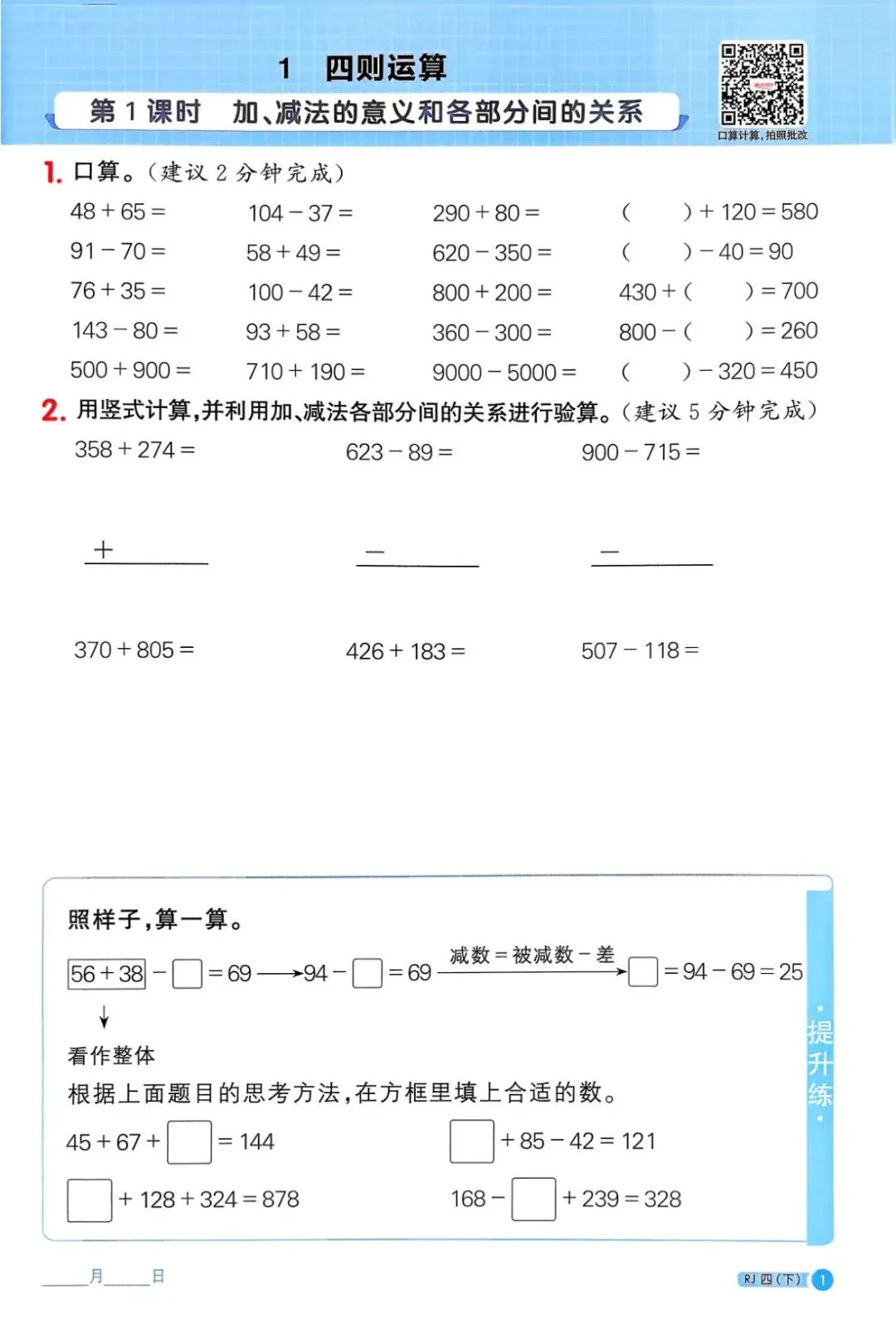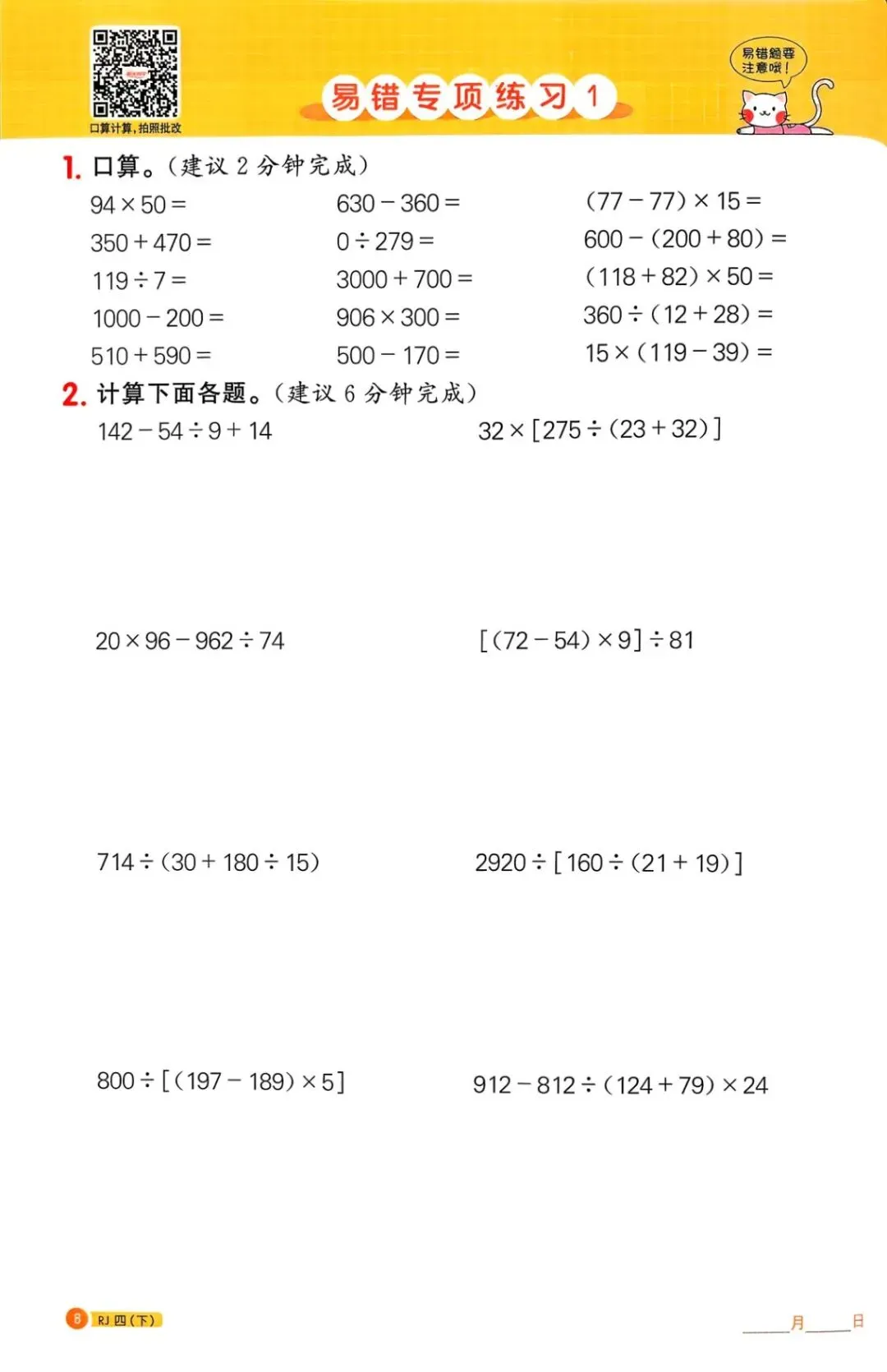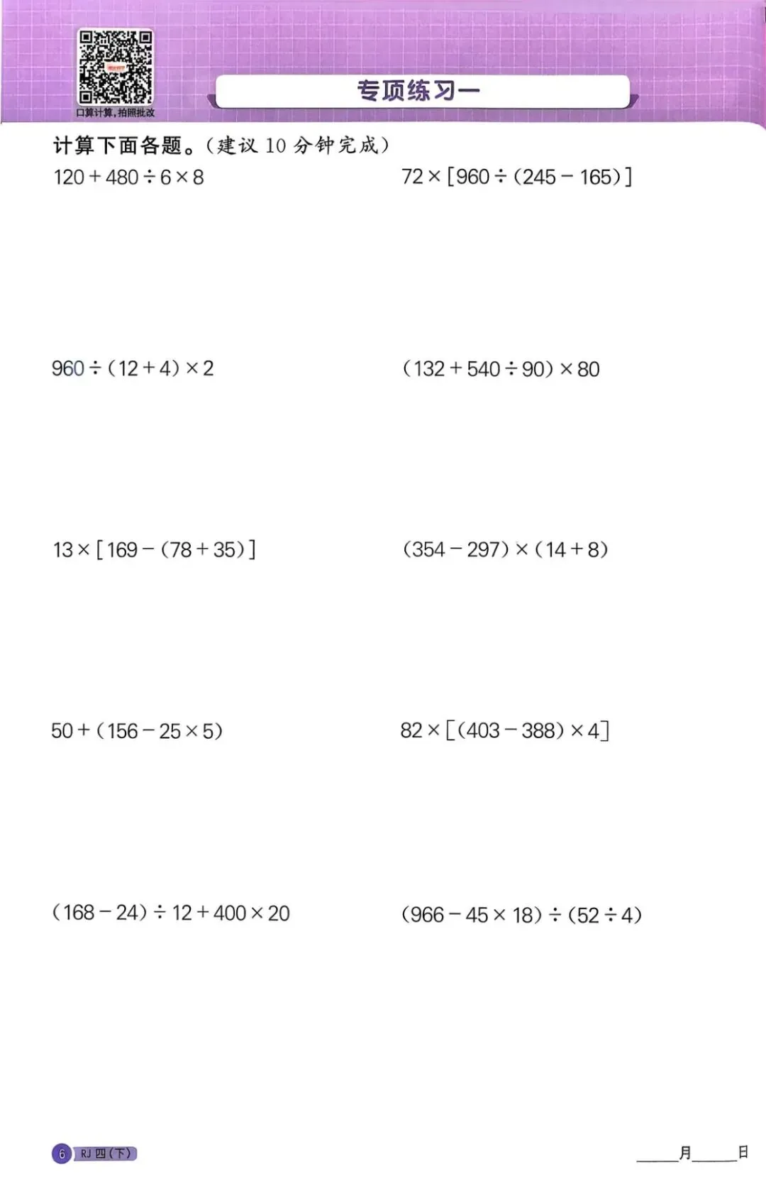 2026春新教材小学数学4年级下册计算题(免费领取,pdf打印)