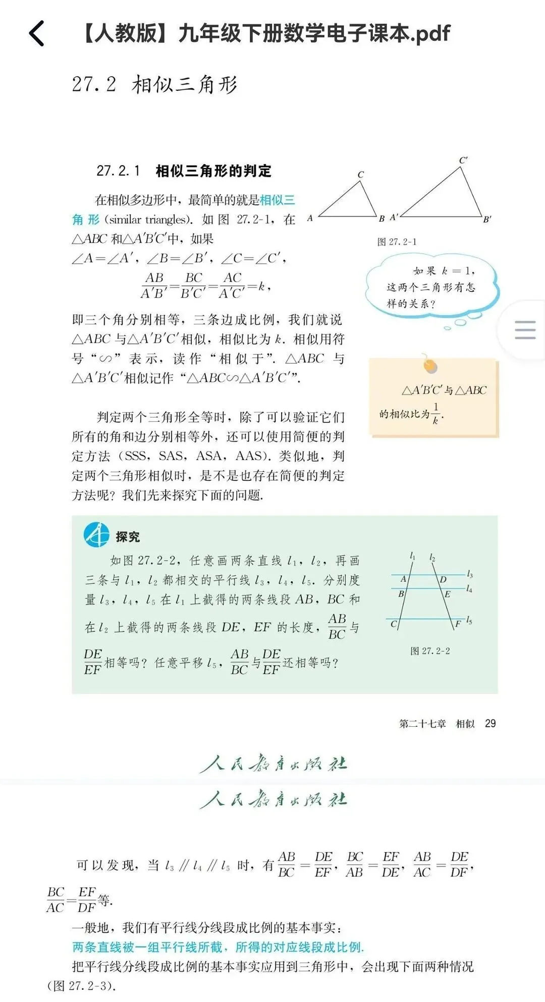 有了这个关键的铺垫结论,我们就可以完全攻克相似三角形对应边成比例定理的证明。先来看第一步如何证明平行线分线段成比例定理。我们可以打开人教版九年级的教材,大家会惊喜地发现这个关键的铺垫结论是通过所谓不完全归纳探究出来的,这个结论被作为一个既定事实加以引入。