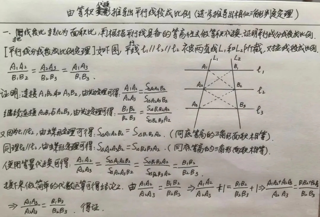 说实话对于任何一个热爱数学严格证明的同学来说,这一所谓既定事实都是完全无法接受的。所以我决定给大家介绍一个对于小学高年级都能理解的证明方法。 这个方法最核心的思想就是把线段间的比例关系转化为面积之比,然后做一次等积等量代换,最后再把面积之比转化为线段之比就证明了书本上通过所谓不完全归纳得出的平行线分线段成比例的结论。