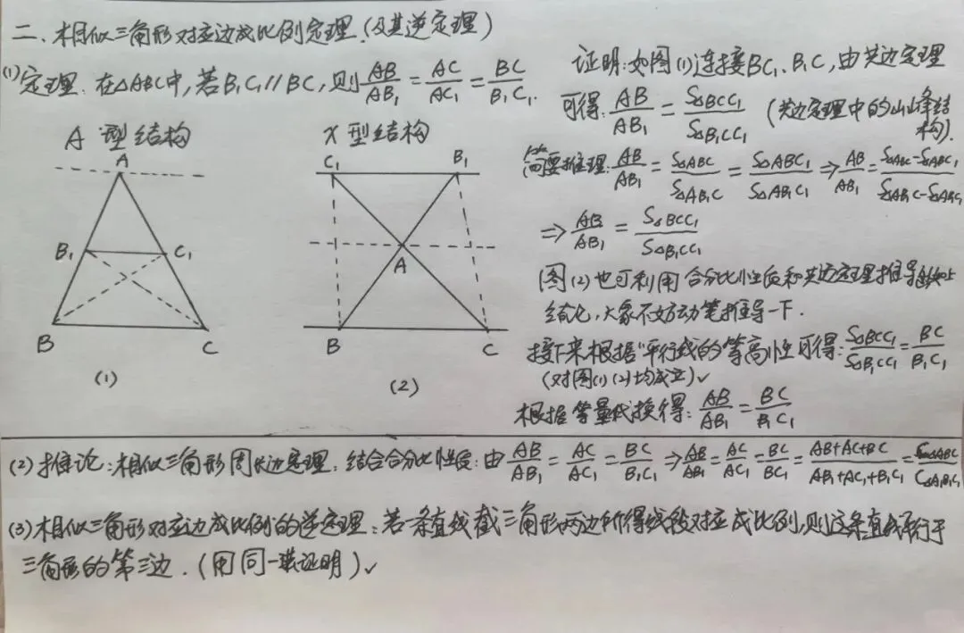 有了上面这个结论,我们就可以来证明相似三角形对应边成比例定理。其核心方法方法还是面积比和线段之比的转化,使用到的重要理论依据还是共边定理的山峰结构和风筝结构,这两种结构的共边定理推导分别用到了比例式中的等比性质。 我们继续用比例的等比性质还可以得到推论2:相似三角形周长之比也等于对应边之比。结合同一法还可以推导出相似三角形对应边成比例的逆定理:若一条直线截三角形两边所得线段对应成比例,则这条直线平行于第三边。