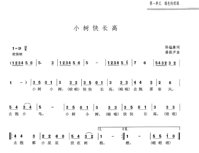一、学唱歌曲《小树快长高》。