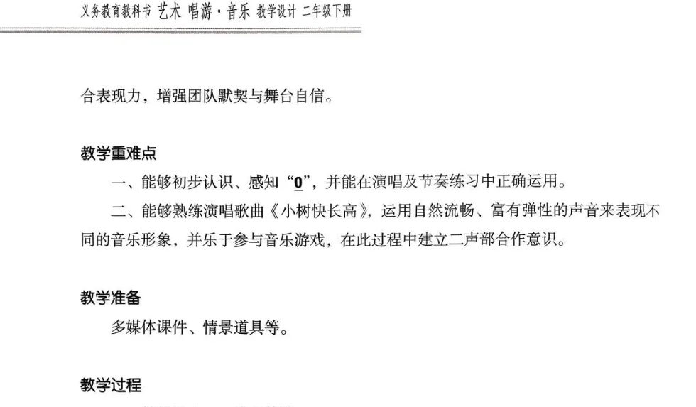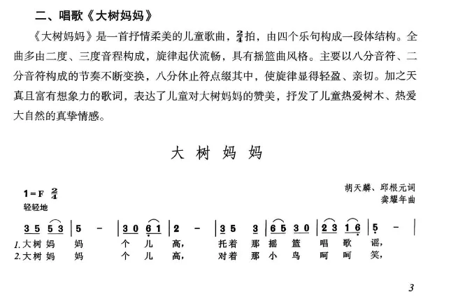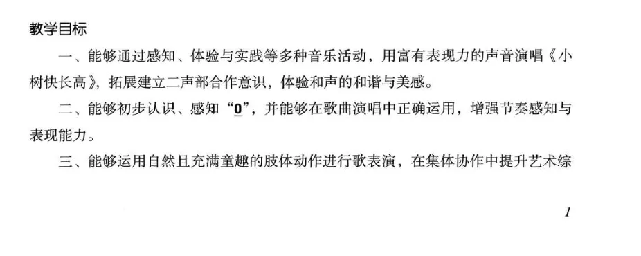 二、持续养成良好的歌唱习惯,掌握科学的发声方法。能够以正确的演唱姿势、自然圆润的声音,准确表现歌曲《小树快长高》《大树妈妈》《郊游》,并运用音乐表现力传递歌曲情绪。能够根据歌曲内容编配简单的表演动作。