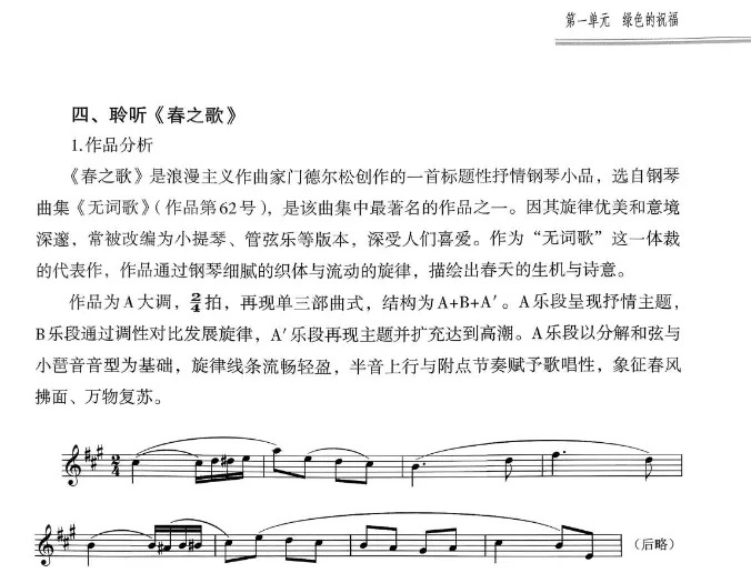 本单元选编的音乐作品包括歌曲《小树快长高》《大树妈妈》《郊游》,钢琴独奏曲《春之歌》以及童声合唱曲《绿色的祖国》。《小树快长高》旋律欢快,歌词简洁,休止符的运用增强了音乐动力,生动地表达了对自然的赞美。《大树妈妈》旋律优美流畅,歌词充满童趣与画面感,适于开展情境表演活动。《郊游》节奏轻快跳跃,情绪积极向上,能够让学生感受自然之美,激发探索欲望。《春之歌》通过钢琴细腻的演奏技巧表现春天的生机,带来美的享受与心灵的慰藉。《绿色的祖国》以清亮的童声合唱,营造出和谐、美好的自然意象,增强集体协作意识与爱国情感。这些作品不仅在音乐上给予学生美的享受,更在情感上激发了爱国情怀,让学生从小树立热爱家园、保护环境的意识。