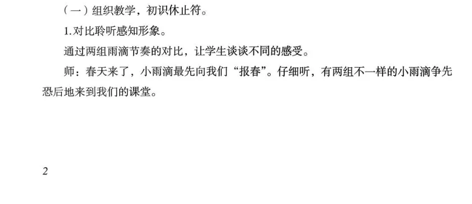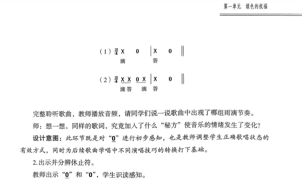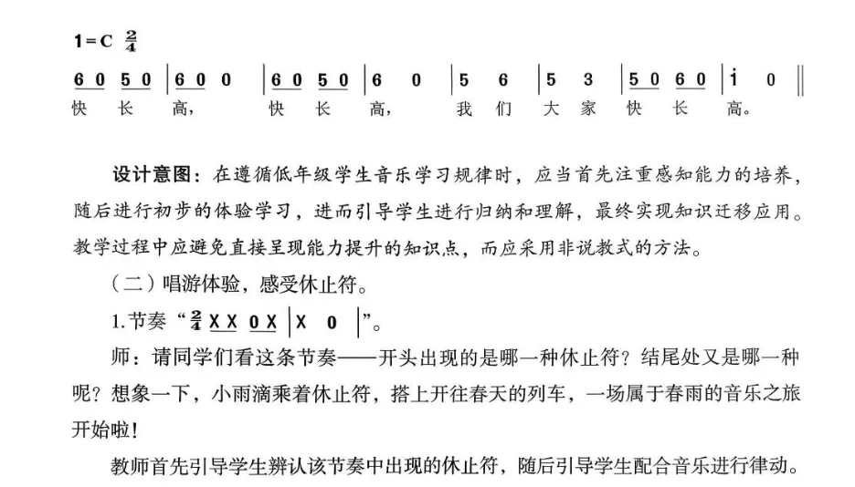 三、能够在演唱中感知并运用八分休止符。在欣赏《春之歌》《绿色的祖国》过程中,借助图形谱、旋律线、情境表演等方式,继续保持专注聆听的习惯。能够初步辨识旋律起伏(音高变化),感知乐曲结构,选择打击乐器为歌曲设计伴奏。