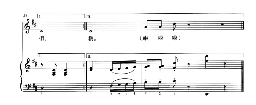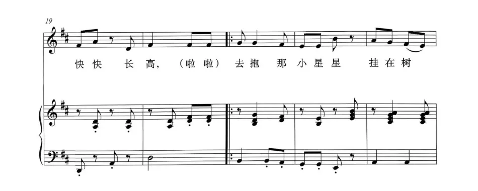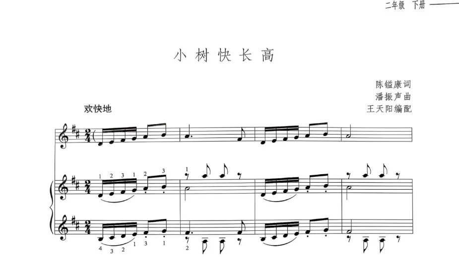 《小树快长高》是一首结构简洁、形象生动的大调式歌曲,由四个乐句构成一段体结构。作品运用完全重复与变化重复的旋律发展手法,以跳跃性与抒情性乐句交替呈现。第一乐句与第三乐句完全重复,其中休止符的巧妙运用增强了灵巧跳跃的律动感,生动描绘出儿童与小树轻声对话的情景。第二乐句与第四乐句采用同头异尾的创作手法,切分节奏的运用增强了歌曲的律动感,形象地表现出小树在风中摇曳的意象。歌词通俗易懂,真挚地表达了儿童盼望小树快快长高的纯真愿望。