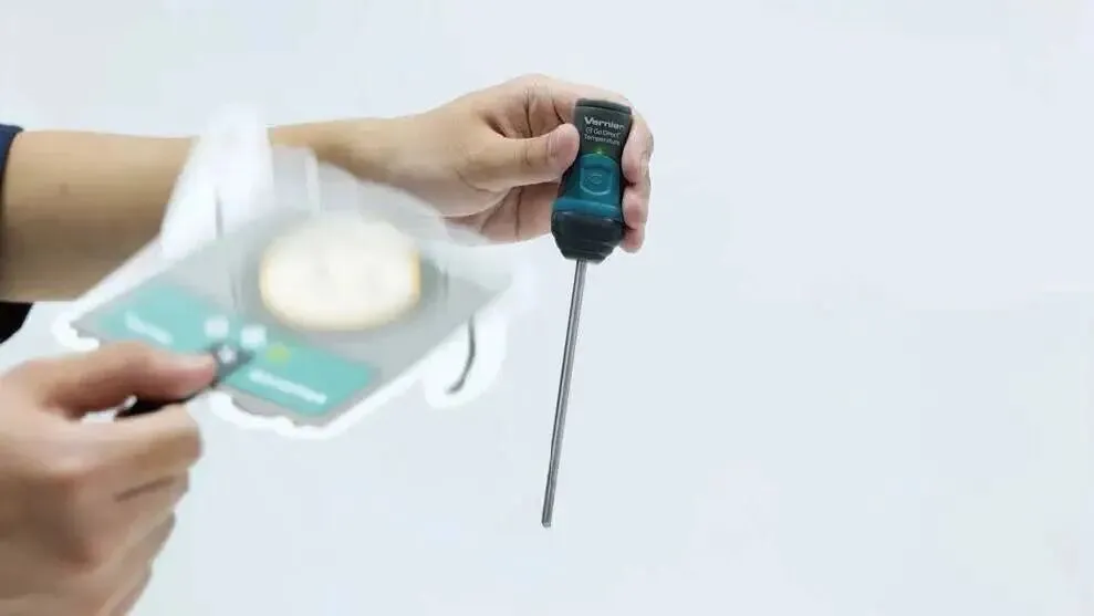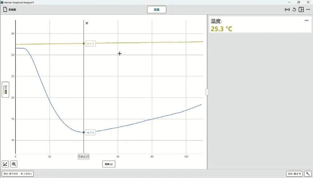 取出探头后,开启数据采集功能,使用扇子对着探头部位扇风,实时观察温度变化曲线,运行一段时间后停止数据采集。