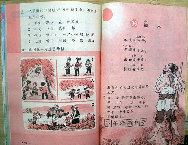 图里是农忙时节,流水线上插秧、施肥、浇水,拖拉机一圈圈轰隆隆开过去,大人孩子都在地里忙,有个男孩扛着铁锹身上全是泥土。小学课本把种地、田野、农忙都画得特别美,实际那是真脏真累,可看在小孩眼里,全是即将放假和收新粮的盼头。