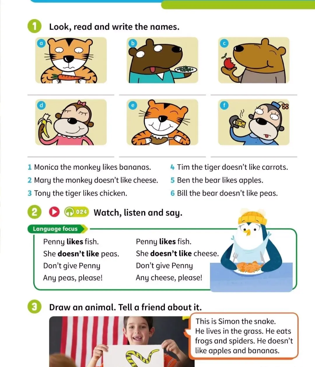 然后通过给学生任务,让他们根据不同的食物的类别,匹配不同的动物。这既是锻炼孩子思维的过程,也涉及到我们现在最常见的环境话题的相关阅读。