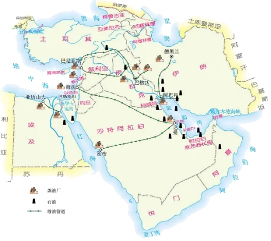 ②读中东地图,知道中东石油的地位、分布、输出路线等。