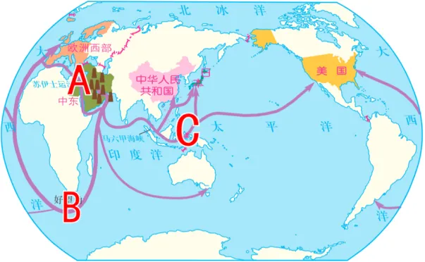 A苏伊士航线 (西线2,近路) | 波斯湾—霍尔木兹海峡—阿拉伯海—红海苏伊士运河—地中海—直布罗陀海峡—大西洋-西欧/北美(小型游轮,航程最短) | 欧洲西部北美洲 |