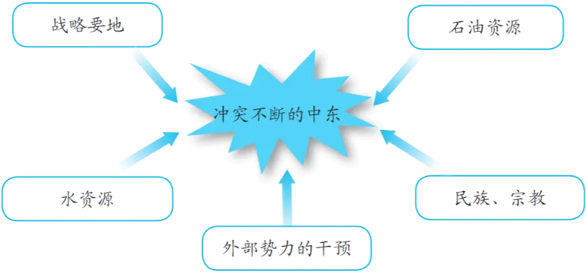 冲突核心原因:位置重要+ 石油丰富 + 水少 + 宗教文化差异 + 外部势力干预