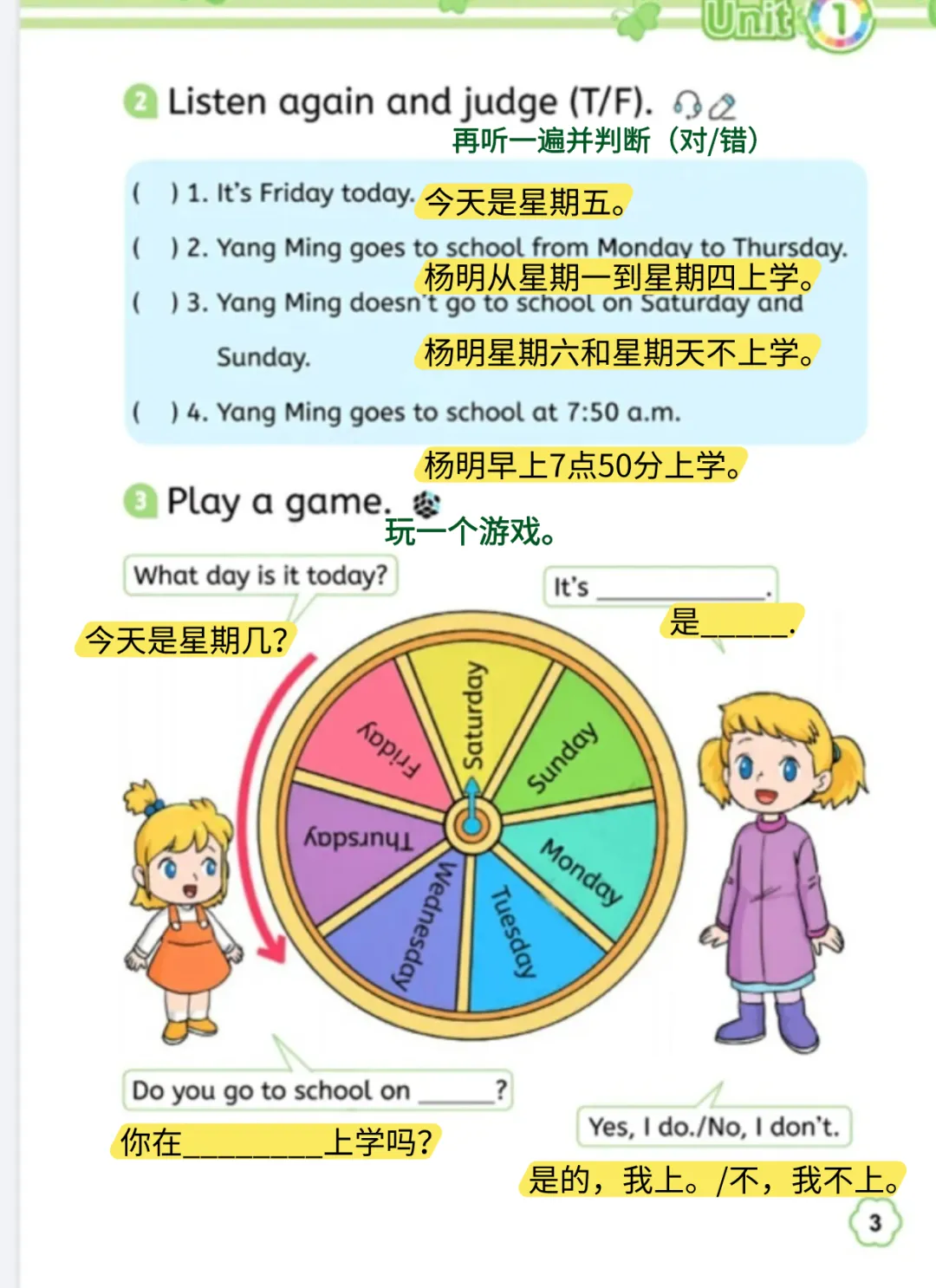 ( ) 3. Yang Ming doesn't go to school on Saturday and Sunday.
